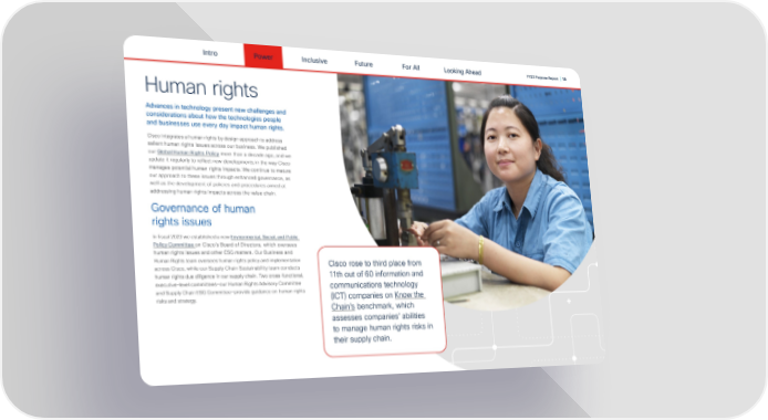 Intro Power Inclusive Future For All FY23 Purpose Report | 15 Looking Ahead Human rights Advances in technology present new challenges and considerations about how the technologies people and businesses use every day impact human rights. Cisco integrates a human rights by design approach to address salient human rights issues across our business. We published our Global Human Rights Policy more than a decade ago, and we update it regularly to re昀氀ect new developments in the way Cisco manages potential human rights impacts. We continue to mature our approach to these issues through enhanced governance, as well as the development of policies and procedures aimed at addressing human rights impacts across the value chain. Governance of human rights issues In 昀椀scal 2023 we established a new Environmental, Social, and Public Policy Committee on Cisco’s Board of Directors, which oversees human rights issues and other ESG matters. Our Business and Human Rights team oversees human rights policy and implementation Cisco rose to third place from across Cisco, while our Supply Chain Sustainability team conducts human rights due diligence in our supply chain. Two cross-functional, 11th out of 60 information and executive-level committees—our Human Rights Advisory Committee communications technology and Supply Chain ESG Committee—provide guidance on human rights (ICT) companies on Know the risks and strategy. Chain’s benchmark, which assesses companies’ abilities to manage human rights risks in their supply chain.