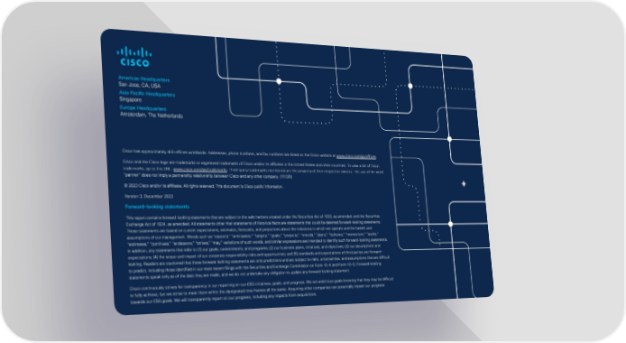 Americas Headquarters San Jose, CA, USA Asia Pacific Headquarters Singapore Europe Headquarters Amsterdam, The Netherlands Cisco has approximately 400 offices worldwide. Addresses, phone numbers, and fax numbers are listed on the Cisco website at www.cisco.com/go/offices. Cisco and the Cisco logo are trademarks or registered trademarks of Cisco and/or its affiliates in the United States and other countries. To view a list of Cisco trademarks, go to this URL: www.cisco.com/go/trademarks. Third-party trademarks mentioned are the property of their respective owners. The use of the word “partner” does not imply a partnership relationship between Cisco and any other company. (111OR) © 2023 Cisco and/or its affiliates. All rights reserved. This document is Cisco public information. Version 3, December 2023 Forward-looking statements This report contains forward-looking statements that are subject to the safe harbors created under the Securities Act of 1933, as amended, and the Securities Exchange Act of 1934, as amended. All statements other than statements of historical facts are statements that could be deemed forward-looking statements. These statements are based on current expectations, estimates, forecasts, and projections about the industries in which we operate and the beliefs and assumptions of our management. Words such as “expects,” “anticipates,” “targets,” “goals,” “projects,” “intends,” “plans,” “believes,” “momentum,” “seeks,” “estimates,” “continues,” “endeavors,” “strives,” “may,” variations of such words, and similar expressions are intended to identify such forward-looking statements. In addition, any statements that refer to (1) our goals, commitments, and programs; (2) our business plans, initiatives, and objectives; (3) our assumptions and expectations; (4) the scope and impact of our corporate responsibility risks and opportunities; and (5) standards and expectations of third parties are forward- looking. Readers are cautioned that these forward-looking statements are only predictions and are subject to risks, uncertainties, and assumptions that are difficult to predict, including those identified in our most recent filings with the Securities and Exchange Commission on Form 10-K and Form 10-Q. Forward-looking statements speak only as of the date they are made, and we do not undertake any obligation to update any forward-looking statement. Cisco continuously strives for transparency in our reporting on our ESG initiatives, goals, and progress. We set ambitious goals knowing that they may be difficult to fully achieve, but we strive to meet them within the designated time frames all the same. Acquiring other companies can potentially impact our progress towards our ESG goals. We will transparently report on our progress, including any impacts from acquisitions.