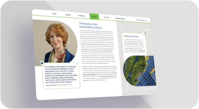 Intro Power Inclusive Future For All FY23 Purpose Report | 37 Looking Ahead Developing more sustainable products The majority of Cisco's Scope 3 emissions are attributable to product use. By embedding circularity and sustainability into the design of our products, we can have a signi昀椀cant impact. We are working to Enabling smart grids reduce our Scope 3 emissions, and our customers’ emissions, by Enel, Italy’s largest electricity provider, uses engineering more energy-e昀케cient products and developing solutions that can power smart buildings and other sustainable infrastructure. Cisco technology to monitor its energy grid For example, the recently announced Cisco Silicon One G200 chip and preemptively address faults or failures. optimizes workloads while keeping costs and power low. For over a Cisco also helps Enel connect to renewable energy sources, like solar and wind energy, decade, Uni昀椀ed Computing System servers have been engineered with sustainability in mind. The product recently received the 2023 at scale, speeding the transition to a low- Sustainability, Environmental Achievement, and Leadership (SEAL) carbon electrical grid. See our ESG Reporting Sustainable Product Award. Built with modular, easily removable Hub for more ways we’re helping customers. components, its upgradeable designs help to extend the use of the chassis, power supply, cooling, and other major components, and are optimized for repair, reuse, and eventually recycling. The latest X-Series architecture also features technology innovations such as e昀케cient 54V power distribution, intelligent fan controls, zone-based cooling, and 80 Plus Titanium-rated power supplies. With network infrastructure growing increasingly complex, the Nexus Our customers and partners are a key part Dashboard provides a single focal point to unite data center and cloud of our environmental strategy to build a networking operations. Operators can use telemetry to learn about regenerative future. We are in a unique their network’s impact on energy, cost, and emissions through Cisco position to help them make progress Nexus Dashboard Insights sustainability reports. Similarly, the Webex toward their sustainability goals and enable Control Hub recently launched the Carbon Emissions Insights widget, them to optimize energy consumption, which allows companies to view the estimated energy consumption lower costs, achieve greater performance, and carbon emissions of their Cisco devices. and minimize their carbon footprint." -Mary de Wysocki, Chief Sustainability O昀케cer
