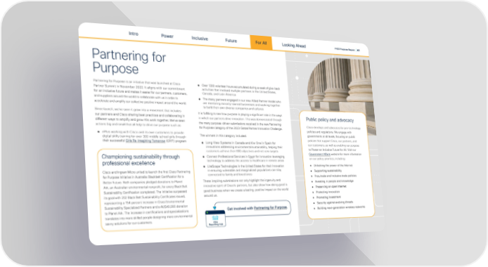 Intro Power Inclusive Future For All FY23 Purpose Report | 61 Looking Ahead Partnering for Purpose Partnering for Purpose is an initiative that was launched at Cisco ● Over 1300 volunteer hours accumulated during a week of give-back Partner Summit in November 2022. It aligns with our commitment activities that involved multiple partners in the United States, for an inclusive future and makes it easier for our partners, customers, Canada, and Latin America and suppliers around the world to collaborate with us in order to ● The many partners engaged in our new Allied Partner model who accelerate and amplify our collective positive impact around the world. are mentoring minority-owned businesses and working together to build their own diverse companies and cultures Since launch, we’ve seen it grow into a movement that includes our partners and Cisco sharing best practices and collaborating in It is ful昀椀lling to see how purpose is playing a signi昀椀cant role in the ways Public policy and advocacy in which our partners drive innovation. This was demonstrated through di昀昀erent ways to amplify and grow this work together. We’ve seen the many purpose-driven submissions received in the new Partnering actions big and small that all help to drive our purpose such as: for Purpose category of the 2023 Global Partner Innovation Challenge. Cisco develops and advocates for pro-technology ● ePlus working with Cisco and its own customers to provide policies and regulations. We engage with digital skills training for over 300 middle school girls through The winners in this category included: governments at all levels, focusing on public their successful Girls Re-Imagining Tomorrow (GRIT) program ● Long View Systems in Canada and Kiw One in Spain for policies that support Cisco, our partners, and innovations addressing environmental sustainability, helping their our customers, as well as enabling our purpose customers achieve their ESG objectives and net-zero targets to Power an Inclusive Future for All. Visit our Championing sustainability through ● Connect Professional Services in Egypt for innovation leveraging Government A昀昀airs website for more information professional excellence technology to address the access to healthcare in remote areas on our policy priorities, including: ● LiteScape Technologies in the United States for their innovation ● Unlocking the power of the Internet in ensuring vulnerable and marginalized populations can stay Cisco and Ingram Micro united to launch the 昀椀rst Cisco Partnering ● Supporting sustainability connected to family and loved ones for Purpose Initiative in Australia: Blackbelt Certi昀椀cation for a ● Free trade and inclusive trade policies Better Future. Both companies pledged donations to Planet These inspiring submissions not only highlight the ingenuity and ● Investing in people and knowledge innovative spirit of Cisco’s partners, but also show how doing good is Ark, an Australian environmental nonpro昀椀t, for every Black Belt ● Preserving an open Internet good business when we create a lasting, positive impact on the world Sustainability Certi昀椀cation completed. The initiative surpassed around us. ● Protecting innovation its goal with 202 Black Belt Sustainability Certi昀椀cates issued, representing a 154 percent increase in Cisco Environmental ● Promoting investment Sustainability Specialized Partners and a AU$40,000 donation ● Security against evolving threats Get involved with Partnering for Purpose. to Planet Ark. The increase in certi昀椀cations and specializations ● Building next-generation wireless networks translates into more skilled people designing more environmental savvy solutions for our customers. ESG Reporting Hub