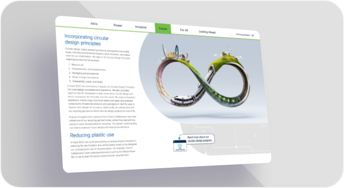 Intro Power Inclusive Future For All FY23 Purpose Report | 42 Looking Ahead Incorporating circular design principles Circular design means designing products and systems that enable reuse, minimize environmental impacts, drive innovation, and realize value for our stakeholders. We align to 25 Circular Design Principles organized across 昀椀ve focus areas: 1. Material use 2. Standardization and modularization 3. Packaging and accessories 4. Smart energy consumption 5. Disassembly, repair, and reuse In 昀椀scal 2023, we continued to integrate our Circular Design Principles into core design processes and operations. We also provided opportunities for employees to learn more about circular design and better incorporate the Principles into their work. We organized product teardowns, where cross-functional teams took apart and analyzed components of selected products and packaging to identify ways to improve their design for circularity. Additionally, we collaborated with our recycling partners to inform how we design products for end of life. A group of supply chain engineers from Cisco's Collaboration team also visited one of our recycling partner’s sites, where they learned how products were disassembled for recycling. This greater understanding can inform engineers' future design and material use decisions. Reducing plastic use Read more about our In 昀椀scal 2023, we continued working on several projects focused on reducing the use of plastic and, where plastic could not be designed circular design program. out, increasing the use of recycled plastic. For example, Cisco's ESG Collaboration team redesigned products such as the Webex Room Reporting Hub Bar to use at least 55 percent postconsumer recycled resin.