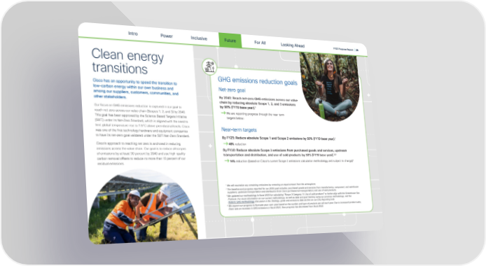 Intro Power Inclusive Future For All FY23 Purpose Report | 35 Looking Ahead Clean energy transitions GHG emissions reduction goals Cisco has an opportunity to speed the transition to Net-zero goal low-carbon energy within our own business and among our suppliers, customers, communities, and By 2040: Reach net-zero GHG emissions across our value other stakeholders. chain by reducing absolute Scope 1, 2, and 3 emissions 1 Our focus on GHG emissions reduction is captured in our goal to by 90% (FY19 base year). reach net zero across our value chain (Scopes 1, 2, and 3) by 2040. We are reporting progress through the near-term This goal has been approved by the Science Based Targets initiative targets below: (SBTi) under its Net-Zero Standard, which is aligned with the need to limit global temperature rise to 1.5°C above preindustrial levels. Cisco Near-term targets was one of the 昀椀rst technology hardware and equipment companies to have its net-zero goal validated under the SBTi Net-Zero Standard. 1 By FY25: Reduce absolute Scope 1 and Scope 2 emissions by 90% (FY19 base year). Cisco’s approach to reaching net zero is anchored in reducing 48% reduction emissions across the value chain. Our goal is to reduce all scopes By FY30: Reduce absolute Scope 3 emissions from purchased goods and services, upstream of emissions by at least 90 percent by 2040 and use high-quality transportation and distribution, and use of sold products by 30% (FY19 base year).2,3 carbon removal o昀昀sets to reduce no more than 10 percent of our 4 residual emissions. 14% reduction (based on Cisco’s current Scope 3 emissions calculation methodology and subject to change) 1 We will neutralize any remaining emissions by removing an equal amount from the atmosphere. 2 The baseline and progress reported for our 2030 goal includes: purchased goods and services from manufacturing, component, and warehouse suppliers; upstream transportation and distribution from Cisco purchased air transportation; and use of sold products. 3 We updated our methodology in 昀椀scal 2023 for calculating "Scope 3 Category 11: Use of sold products" to further align with the Greenhouse Gas Protocol. For more information on our current methodology, as well as data and goal tracking using our previous methodology, visit the Historic GHG methodology discussion in the Strategy, goals and emissions data section on our ESG Reporting Hub. 4 We expect our progress to 昀氀uctuate year-over-year based on the number and type of products we sell each year. Due to increased product sales, there was an increase in GHG emissions in 昀椀scal 2023, thus progress has decreased from 昀椀scal 2022.