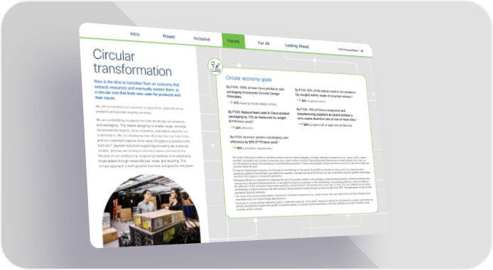 Intro Power Inclusive Future For All FY23 Purpose Report | 41 Looking Ahead Circular transformation Circular economy goals By FY25: 100% of new Cisco products and By FY25: 50% of the plastic used in our products Now is the time to transition from an economy that extracts resources and eventually wastes them, to packaging incorporate Circular Design (by weight) will be made of recycled content.4 1 a circular one that 昀椀nds new uses for products and Principles. 24% recycled content their inputs. 27% meeting circular design criteria We aim to transform our business to extend the useful life of our By FY25: 70% of Cisco component and products and provide ongoing services. By FY25: Reduce foam used in Cisco product manufacturing suppliers by spend achieve a packaging by 75% as measured by weight zero-waste diversion rate at one or more sites.5 We are embedding circularity into how we design our products (FY19 base year).2 60% by spend with at least one certi昀椀ed site and packaging. This means designing to enable reuse, minimize 22% reduction environmental impacts, drive innovation, and realize value for our stakeholders. We are deploying new o昀昀erings that can help Cisco By FY25: Increase product packaging cube and our customers capture more value throughout a product’s life, 3 ef昀椀ciency by 50% (FY19 base year). such as IT payment solutions supporting circularity-as-a-service 65% cumulative improvement models. And we are striving to minimize waste and extend the lifecycle of our products by recapturing hardware and redeploying 1 The scope of this goal is limited to hardware products and associated packaging, excluding: standalone components (e.g., chassis, ASICs, optical those assets through remanufacture, reuse, and recycling. This modules); standalone basic product accessories (e.g., power cables, brackets); Original Equipment Manufacturer products (where Cisco does not circular approach is both good for business and good for the planet. own the design); products and packaging of nonintegrated acquisitions. Product and packaging designs achieving a score of 75 percent or higher are counted toward the goal. 2 To improve measurement accuracy, we changed our methodology for this goal in 昀椀scal 2023 to calculate the foam used in our shipped product packaging instead of the total foam purchased from suppliers. The base year (昀椀scal 2019) foam use was recalculated using the updated methodology, and 昀椀scal 2023 progress is measured against this. 3 Packaging e昀케ciency is measured by comparing the size of the product relative to the packaging, using dimensional weight. Dimensional weight uses volume and a standard dimensional factor to calculate the weight of a package. In this methodology, the packaging e昀케ciency metric is based on the di昀昀erence of the normalized dimensional weight (by volume) between the baseline and current year. In 昀椀scal 2023, we updated our calculation methodology to improve accuracy. We will continue to report progress toward this goal annually through 昀椀scal 2025. This goal applies to high-volume packaging requiring redesigns. 4 The scope of this goal excludes plastics contained in commodity components (e.g., plastic screws, fans, and cables) and in products designed and manufactured by our Original Design Manufacturers. 5 According to current standard de昀椀nitions used in certi昀椀cation protocols, “zero-waste” diversion is de昀椀ned as a 90 percent or greater overall diversion of solid, nonhazardous wastes from land昀椀ll, incineration (waste-to-energy), and the environment. Diversion methods can include reduction, reuse, recycling, and/or compost.