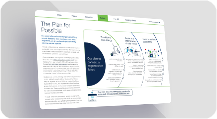 Intro Power Inclusive Future For All FY23 Purpose Report | 34 Looking Ahead The Plan for Possible Transition to Evolve to a Invest in resilient In a world where climate change is amplifying clean energy regenerative, ecosystems natural disasters, food shortages, and mass circular model migrations, we are embedding sustainability into the way we operate. Through collaboration, we believe we can help build not just a sustainable future, but a regenerative one. This means moving to a mindset in which we build the capacity of our social and environmental systems to heal and thrive. Cisco published its 昀椀rst corporate citizenship report in 2005. Our plan to Lead in energy-e昀케ciency Adopt business models to extend Reduce the impacts of our Since that time, global atmospheric carbon levels have innovation the value of our products and business on water, waste, increased from approximately 379 to 419 parts per million. connect a reduce environmental impacts ecosystems, and biodiversity Average land and ocean temperatures have increased by Connect clean energy and Invest in technology more than half a degree. With this sense of urgency in mind, regenerative digitize the grid incubation to be at pace with Enable communities to adapt to environmental science climate realities Cisco revealed The Plan for Possible, our next-generation future Collaborate with our Cultivate skills and talent for environmental sustainability strategy, in 昀椀scal 2023. The Champion a digital, customers, partners, and the regenerative economy strategy has three priorities, as seen at right. nature-positive value chain, suppliers to accelerate the Deploy Cisco technology energy transition leveraging our global reach to protect and restore Underpinning our new strategy is an enhanced governance ecosystems and biodiversity Continue to increase our model, led by Cisco’s 昀椀rst Chief Sustainability O昀케cer, use of renewable energy in Harness AI, IoT, and blockchain to Mary de Wysocki. In 昀椀scal 2023, we created the Cisco Cisco’s operations Sustainability Council, with representation from functions advance regenerative models across the business, to drive cross-company governance and execution. We also established governance processes for external communications, public goals, and claims related to environmental sustainability. Read more about how we’re driving sustainability Through enhanced governance, we are managing risk, across each of these priorities and explore data. increasing the transparency with which we communicate about sustainability, and upholding the high level of trust our ESG Reporting Hub customers and others have come to expect from Cisco.