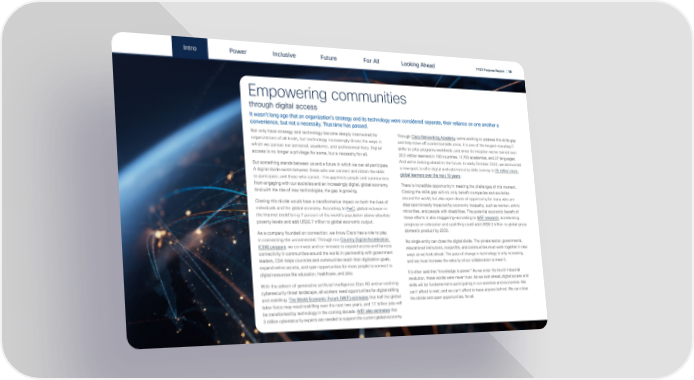 Intro Power Inclusive Future For All FY23 Purpose Report | 10 Looking Ahead Empowering communities through digital access It wasn’t long ago that an organization’s strategy and its technology were considered separate, their reliance on one another a convenience, but not a necessity. That time has passed. Not only have strategy and technology become deeply intertwined for Through Cisco Networking Academy, we’re working to address this skills gap organizations of all kinds, but technology increasingly drives the ways in and help stave o昀昀 a potential skills crisis. It is one of the longest-standing IT which we pursue our personal, academic, and professional lives. Digital skills-to-jobs programs worldwide, and since its inception we’ve trained over access is no longer a privilege for some, but a necessity for all. 20.5 million learners in 190 countries, 11,700 academies, and 27 languages. But something stands between us and a future in which we can all participate. And we’re looking ahead to the future. In early October 2022, we announced A digital divide exists between those who can connect and obtain the skills a new goal, to o昀昀er digital and cybersecurity skills training to 25 million more to participate, and those who cannot. This gap limits people and communities global learners over the next 10 years. from engaging with our societies and an increasingly digital, global economy. There is incredible opportunity in meeting the challenges of this moment. And with the rise of new technologies, the gap is growing. Closing the skills gap will not only bene昀椀t companies and societies Closing this divide would have a transformative impact on both the lives of around the world, but also open doors of opportunity for many who are individuals and the global economy. According to PwC, global inclusion in disproportionately impacted by economic inequality, such as women, ethnic the Internet could bring 7 percent of the world’s population above absolute minorities, and people with disabilities. The potential economic bene昀椀t of poverty levels and add US$6.7 trillion to global economic output. these e昀昀orts is also staggering—according to WEF research, accelerating progress on education and upskilling could add US$8.3 trillion to global gross As a company founded on connection, we know Cisco has a role to play domestic product by 2030. in connecting the unconnected. Through our Country Digital Acceleration No single entity can close the digital divide. The private sector, governments, (CDA) program, we co-invest and co-innovate to expand access and harness connectivity in communities around the world. In partnership with government educational institutions, nonpro昀椀ts, and communities must work together in new leaders, CDA helps countries and communities reach their digitization goals, ways as we look ahead. The pace of change in technology is only increasing, expand online access, and open opportunities for more people to connect to and we must increase the velocity of our collaboration to meet it. digital resources like education, healthcare, and jobs. It's often said that “knowledge is power.” As we enter the fourth industrial revolution, these words were never truer. As we look ahead, digital access and With the advent of generative arti昀椀cial intelligence (Gen AI) and an evolving skills will be fundamental to participating in our societies and economies. We cybersecurity threat landscape, all workers need opportunities for digital skilling and reskilling. The World Economic Forum (WEF) estimates that half the global can’t a昀昀ord to wait, and we can’t a昀昀ord to leave anyone behind. We can close labor force may need reskilling over the next two years, and 1.1 billion jobs will the divide and open opportunities, for all. be transformed by technology in the coming decade. WEF also estimates that 3 million cybersecurity experts are needed to support the current global economy.