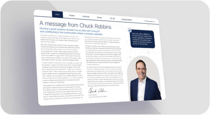 Intro Power Inclusive Future For All FY23 Purpose Report | 3 Looking Ahead A message from Chuck Robbins Running a great business shouldn’t be at odds with caring for Cisco has made a di昀昀erence “ and contributing to the communities where a company operates. for more than one-eighth of the world’s population—a testament The dynamic world we live in needs businesses to do both, and su昀昀ering and for causes that change lives. We’re also proud to bring to what we can achieve when companies that successfully 昀椀nd that balance earn customer trust, our customers and partners along with us through initiatives like respect from their peers, and create a culture that attracts and Partnering for Purpose, helping to amplify our impact because we people and purpose intersect in retains the best people. know we can’t solve these issues alone. service of communities." Each year, we are proud to share this report that demonstrates Through our innovation, we’re helping customers securely connect having environmental, social, and governance (ESG) and corporate everything to make anything possible. We’re also driving sustainability social responsibility e昀昀orts woven into a business strategy is in a meaningful way with products and solutions, such as IoT, Silicon not just good for the world; it also creates important business One, and power over ethernet, that help customers reduce energy opportunities. Through our commitments and actions, Cisco also consumption. With technologies such as arti昀椀cial intelligence (AI) continues to rea昀케rm its support of the Ten Principles of the United quickly taking shape, we continue to see endless possibilities for Nations Global Compact (UNGC) in the areas of Human Rights, Labor, technology to change lives and experiences in countless ways. We Environment, and Anti-Corruption, which Cisco signed in 2001. also recognize the need to harness the power of technology ethically Through a powerful combination of our technology, our people, and and responsibly as we shape and de昀椀ne the future alongside our our purpose—to power an inclusive future for all—we have helped customers and partners. customers and communities all around the globe, and this year For nearly 40 years, Cisco’s technology has been at the heart of we’re celebrating an amazing milestone. In 2016, we set a goal to connections—helping customers run their businesses every day positively impact 1 billion people by 昀椀scal 2025, and I’m incredibly and bringing more opportunities to more people around the world. proud to share that we’ve surpassed that goal more than a year We are incredibly proud of this history—the impact we’ve made and early. Together, we have made a real, tangible di昀昀erence for more milestones we’ve achieved—but we know there is more to do to care than one-eighth of the world’s population. This is truly a testament for our planet and build a more inclusive and equitable future for to what a company can achieve when its people and purpose everyone. At Cisco, we work hard every day to prove that running a intersect in service of communities. good business and a passion to do good absolutely can and should It also speaks to the importance of a culture that fosters opportunities live in the same place—because when they do, change and progress and supports people as they go out and do good in the world. take giant steps forward toward a better world for all of us. From global con昀氀icts to natural disasters, we often see that the most marginalized communities are usually impacted the most. In 昀椀scal 2023, 85 percent of our employees took action to give back to communities and support causes close to their hearts. Our Chuck Robbins people continue to show up in times of crisis, for those who are Chair and Chief Executive O昀케cer