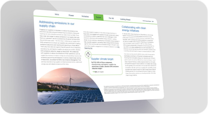 Intro Power Inclusive Future For All FY23 Purpose Report | 39 Looking Ahead Addressing emissions in our Collaborating with clean supply chain energy initiatives Engaging our suppliers is necessary to reduce the emissions that Cisco also supports suppliers in their clean energy transitions. In In January 2023, Cisco joined the Eco-Skies Alliance, which brings arise from manufacturing and transporting our products. Along with together United Airlines and leading global corporations to help 昀椀scal 2023, we engaged with suppliers through surveys and in direct reaching net-zero emissions across our value chain by 2040, Cisco conversations to better understand their own challenges in GHG power lower-emissions air travel by investing in sustainable aviation has a near-term target to reduce emissions in our supply chain and emissions reductions and renewable energy utilization. Looking fuel (SAF). SAF is a biofuel with similar properties to conventional from our customers’ use of our products by 30 percent by 昀椀scal 2030 ahead, we are working on developing a renewable energy strategy to jet fuel but a smaller carbon footprint. Depending on the feedstock 1 (昀椀scal 2019 base year). The 昀椀rst step in reducing our supply chain help us guide suppliers in accessing clean energy solutions that are and technologies used to produce it, SAF can reduce lifecycle GHG emissions is to ensure our suppliers are committed to making right for them and that add new renewable energy to the grid. Learn GHG emissions dramatically, compared to conventional jet fuel. For emissions reductions and tracking and reporting on those e昀昀orts. more about supplier engagement on emissions reduction in our ESG now, SAF is not widely available and is not yet incorporated in our That’s why Cisco also set a goal to have 80 percent of our component, Reporting Hub. emissions accounting reporting. With this investment, however, Cisco manufacturing, and logistics suppliers by spend set a public, absolute is sending a demand signal to support increased production of SAF. GHG emissions reduction target by 昀椀scal 2025. We collaborate Cisco also recently joined the RE100 initiative, which brings together with suppliers to reduce the emissions of their operations, such as businesses committed to 100 percent renewable electricity. supporting initiatives to reduce energy use and providing resources for Sourcing more renewable energy is an important part of Cisco’s emissions accounting and absolute or science-based target setting. Supplier climate target goal to reach net zero by 2040 and our near-term Scope 1 and 2 In 昀椀scal 2023, we piloted the RBA's new Emissions Management Tool target. Beyond helping us make progress toward our own goals, with key manufacturing suppliers to help businesses better understand By FY25: 80% of Cisco component, joining RE100 supports Cisco’s ambition to increase clean energy energy use and related emissions at their sites. manufacturing, and logistics suppliers by access globally and contributes to the private-sector demand for spend have a public, absolute GHG emissions renewables. We also continue to engage with renewable energy 2 reduction target. providers and buyers through the Clean Energy Buyers Alliance 92% with targets (CEBA) and the U.S. Environmental Protection Agency's Green Power Partnership, and we are a founding member of the Asia Clean Energy Coalition. 1 The baseline and progress reported for our 2030 goal includes: purchased goods and services from manufacturing, component, and warehouse suppliers; upstream transportation and distribution from Cisco purchased air transportation; and use of sold products. 2 Suppliers are expected to set absolute GHG emissions reduction targets or intensity targets that produce an absolute emissions reduction during the target period. Cisco encourages suppliers to set targets in line with an approved science-based methodology. Progress toward this goal is quanti昀椀ed using Cisco’s supply chain spend which can vary annually. Cisco will continue to work with suppliers to set their own absolute GHG emissions reduction targets, and to report progress toward this goal annually through 昀椀scal 2025.