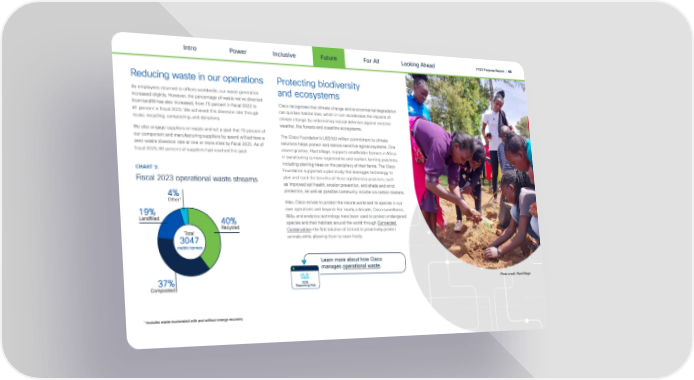 Intro Power Inclusive Future For All FY23 Purpose Report | 45 Looking Ahead Reducing waste in our operations Protecting biodiversity As employees returned to o昀케ces worldwide, our waste generation and ecosystems increased slightly. However, the percentage of waste we’ve diverted from land昀椀ll has also increased, from 75 percent in 昀椀scal 2022 to Cisco recognizes that climate change and environmental degradation 81 percent in 昀椀scal 2023. We achieved this diversion rate through can quicken habitat loss, which in turn accelerates the impacts of reuse, recycling, composting, and donations. climate change by undermining natural defenses against extreme weather, like forests and coastline ecosystems. We also engage suppliers on waste and set a goal that 70 percent of our component and manufacturing suppliers by spend will achieve a The Cisco Foundation’s US$100 million commitment to climate solutions helps protect and restore sensitive agroecosystems. One zero-waste diversion rate at one or more sites by 昀椀scal 2025. As of 昀椀scal 2023, 60 percent of suppliers had reached this goal. recent grantee, PlantVillage, supports smallholder farmers in Africa in transitioning to more regenerative and resilient farming practices, including planting trees on the periphery of their farms. The Cisco CHART 3: Foundation supported a pilot study that leverages technology to Fiscal 2023 operational waste streams plan and track the bene昀椀ts of these agroforestry practices, such as improved soil health, erosion prevention, and shade and wind protection, as well as possible community income via carbon markets. Also, Cisco strives to protect the natural world and its species in our own operations and beyond. For nearly a decade, Cisco surveillance, data, and analytics technology have been used to protect endangered species and their habitats around the world through Connected Conservation—the 昀椀rst solution of its kind to proactively protect animals while allowing them to roam freely. Learn more about how Cisco manages operational waste. ESG Reporting Hub