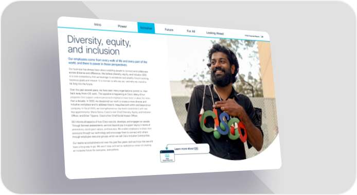 Intro Power Inclusive Future For All FY23 Purpose Report | 24 Looking Ahead Diversity, equity, and inclusion Our employees come from every walk of life and every part of the world, and there is power in those perspectives. Our business has always been about enabling people to connect and collaborate across distance and di昀昀erence. We believe diversity, equity, and inclusion (DEI) is a core competency that we leverage to accelerate and amplify Cisco’s existing business goals and mission. It is intrinsic to who we are—and who we intend to be long into the future. Over the past several years, we have seen many organizations commit to—then back away from—DEI work. The opposite is happening at Cisco. Many of our programs that support underrepresented employees have been in place for more than a decade. In 2020, we deepened our work to create a more diverse and inclusive workplace and to address historic inequities both within and beyond our company. In 昀椀scal 2023, we strengthened our top-level commitment with two key appointments: Gloria Goins, Cisco’s new Chief Diversity, Equity, and Inclusion O昀케cer, and Brian Tippens, Cisco’s 昀椀rst Chief Social Impact O昀케cer. DEI informs all aspects of how Cisco recruits, develops, and engages our people. Through fairness assessments, we look beyond pay to support equity in terms of promotions, stock grant values, and bonuses. We enable employees to share their pronouns through our technology and encourage them to connect with others through employee resource groups, which we call Cisco Inclusive Communities. Our teams accomplished a lot over the past few years—and we know that we still have a long way to go. We won’t stop until we’ve realized our vision of creating an inclusive future for everyone, everywhere. Learn more about DEI. ESG Reporting Hub
