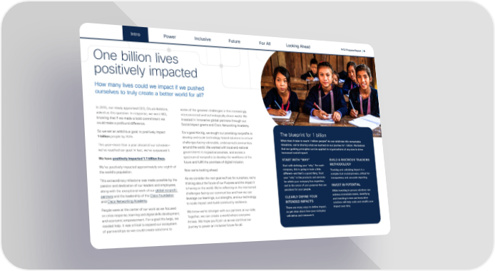 Intro Power Inclusive Future For All FY23 Purpose Report | 9 Looking Ahead One billion lives positively impacted How many lives could we impact if we pushed ourselves to truly create a better world for all? In 2015, our newly appointed CEO, Chuck Robbins, some of the greatest challenges in this increasingly asked us this question. In response, we went BIG, interconnected and technologically driven world. We knowing that if we made a bold commitment we invested in innovative global partners through our could make a profound di昀昀erence. Social Impact grants and Cisco Networking Academy. So we set an ambitious goal: to positively impact For a goal this big, we sought out promising nonpro昀椀ts to The blueprint for 1 billion 1 billion people by 2025. develop and scale technology-based solutions to critical What does it take to reach 1 billion people? As we celebrate this remarkable This year—more than a year ahead of our schedule— challenges facing vulnerable, underserved communities milestone, we’re sharing what we learned on our journey to 1 billion. We believe we’ve reached our goal. In fact, we’ve surpassed it. around the world. We worked with local and national that our guiding principles can be applied to organizations of any size to drive governments to expand economies, and across a increased social impact. We have positively impacted 1.1 billion lives. spectrum of nonpro昀椀ts to develop the workforce of the START WITH “WHY” BUILD A RIGOROUS TRACKING future and ful昀椀ll the promises of digital inclusion. METHODOLOGY We’ve positively impacted approximately one-eighth of Start with de昀椀ning your “why.” For each Now we’re looking ahead. company, this is going to look a little the world’s population. Tracking and validating impact is a di昀昀erent—and that’s a good thing. Root complex but crucial process, critical for As we consider the next goal we'll set for ourselves, we're your “why” in the products and services This extraordinary milestone was made possible by the transparency and accurate reporting. passion and dedication of our leaders and employees, thinking about the future of our Purpose and the impact it for which your company has expertise, and in the areas of your purpose that are INVEST IN POTENTIAL along with the exceptional work of our global nonpro昀椀t is having on the world. We’re re昀氀ecting on the intertwined passions for your people. partners and the leadership of the Cisco Foundation challenges facing our communities and how we can While investing in proven solutions can and Cisco Networking Academy. leverage our learnings, our strengths, and our technology CLEARLY DEFINE YOUR address immediate needs, identifying to scale impact and build community resilience. INTENDED IMPACTS and investing in new and innovative People were at the center of our work as we focused solutions will help scale and amplify your on crisis response, learning and digital skills development, We know we’re stronger with our partners at our side. There are many ways to de昀椀ne impact, impact over time. Together, we can create a world where everyone so get clear about how your company and economic empowerment. For a goal this large, we thrives. We hope you’ll join us as we continue our will de昀椀ne and measure it. needed help. It was critical to expand our ecosystem of partnerships so we could create solutions to journey to power an inclusive future for all.