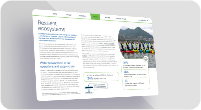 Intro Power Inclusive Future For All FY23 Purpose Report | 44 Looking Ahead Resilient ecosystems As Cisco products are manufactured by our suppliers, water In addition to transitioning to clean energy and adopting stewardship within the supply chain is another area in which we a circular 昀氀ow of materials, Cisco is helping safeguard engage. We work to improve the river basins and ecosystems where the water, land, and ecosystems that businesses and our suppliers operate, focusing on both internal and external water communities depend on. management. As a member of the Alliance for Water Stewardship Within our own operations, we conserve water, reduce waste, and (AWS), we are proud to be a part of a global movement to advance good water stewardship practices. In collaboration with ICT peers, protect wildlife habitats near our o昀케ce locations. We also work with our suppliers to promote environmental stewardship practices we engage high-water-consuming supplier areas located in high- throughout our value chain. More broadly, our products and water-stress areas in water stewardship programs. investments can be used to monitor and manage local resources and In 昀椀scal 2023, we worked with GAIASCAPE Studio under Friends ecosystems. Support from the Cisco Foundation is helping to protect of Nature, a China-based environmental NGO, to train suppliers to and regenerate ecosystems while supporting communities in adapting improve onsite water stewardship through nature-based solution to the realities of a changing climate. workshops, including rainwater harvesting systems, landscaping, Water stewardship in our and wastewater treatment. We also cohosted a “water 昀椀eld trip” with 98% AWS and an industry peer for high-water-consumption suppliers to 1 operations and supply chain learn about the importance of wetland and water source protection on of Cisco key suppliers disclosed to CDP China’s Qiandao Lake. (formerly Carbon Disclosure Project) Water is a vital resource that we share with the communities where we operate. Over the past few years, we have implemented water 76% conservation projects in our direct operations that are still conserving 1 of Cisco key suppliers set water-related water today, like our comprehensive water management system at our In FY23, we withdrew 2164 m3 of water, a Bangalore campus. In 昀椀scal 2023, we withdrew 2164 cubic meters 34% decrease from FY19. targets in CDP of water in our direct operations globally, a 34 percent decrease since 昀椀scal 2019. Annually, we use the World Resources Institute's 16 (WRI) Aqueduct tool to better understand our water use and risks. The Aqueduct tool revealed that 33 percent of Cisco’s water use by Learn more about supplier sites engaged in ICT water volume is withdrawn from water-stressed areas. our water initiatives. stewardship program 1 ESG Key suppliers means Cisco Contract Manufacturers, Strategic Original Design Reporting Hub Manufacturers and Hardware Suppliers in the top 80 percent of spend in 昀椀scal 2023.