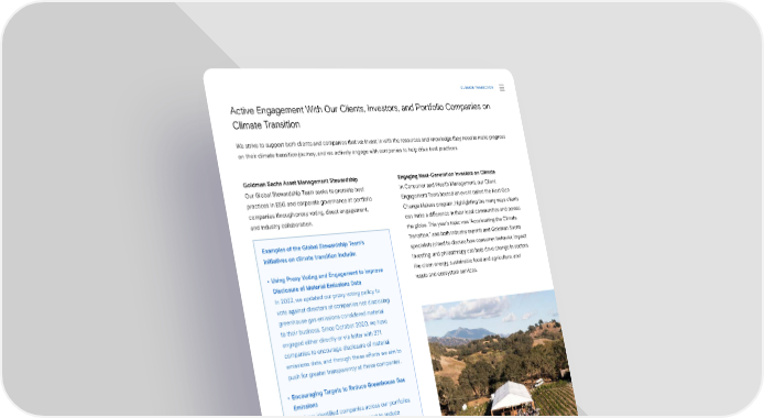 CLIMATE TRANSITION Active Engagement With Our Clients, Investors, and Portfolio Companies on Climate Transition We strive to support both clients and companies that we invest in with the resources and knowledge they need to make progress on their climate transition journey, and we actively engage with companies to help drive best practices. Goldman Sachs Asset Management Stewardship Engaging Next-Generation Investors on Climate Our Global Stewardship Team seeks to promote best In Consumer and Wealth Management, our Client practices in ESG and corporate governance at portfolio Engagement Team hosted an event called the Next Gen companies through proxy voting, direct engagement, Change Makers program, highlighting the many ways clients and industry collaboration. can make a di昀昀erence in their local communities and across the globe. This year’s topic was “Accelerating the Climate Examples of the Global Stewardship Team’s Transition,” and both industry experts and Goldman Sachs initiatives on climate transition include: specialists joined to discuss how consumer behavior, impact investing, and philanthropy can help drive change in sectors • Using Proxy Voting and Engagement to Improve like clean energy, sustainable food and agriculture, and Disclosure of Material Emissions Data waste and ecosystem services. In 2022, we updated our proxy voting policy to vote against directors at companies not disclosing greenhouse gas emissions considered material to their business. Since October 2020, we have engaged either directly or via letter with 271 companies to encourage disclosure of material emissions data, and through these e昀昀orts we aim to push for greater transparency at these companies. • Encouraging Targets to Reduce Greenhouse Gas Emissions We have identi昀椀ed companies across our portfolios that have not yet disclosed a target to reduce emissions, and we seek to engage with these companies to set and disclose targets to reduce GHG emissions. • Managing Risks Related to Biodiversity We are engaging with a targeted group of high- impact companies to understand their approach to key issues such as plastics, packaging and waste, and responsible land use while promoting accountability and best practices. For more information on how Goldman Sachs Asset Management engages with hundreds of companies around the world, please review our Stewardship Report. Sustainability Report 2021 Climate Transition | Driving Transition 26