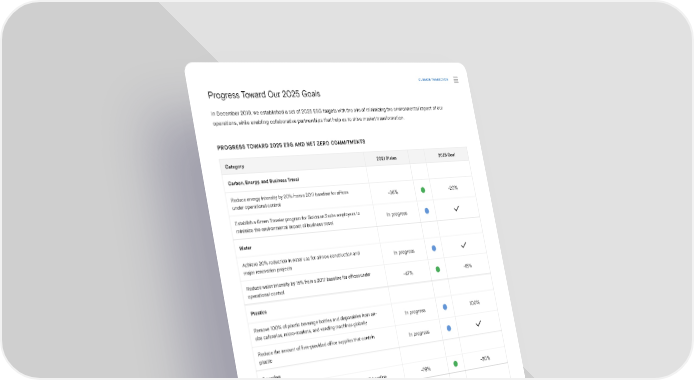 CLIMATE TRANSITION Progress Toward Our 2025 Goals In December 2019, we established a set of 2025 ESG targets with the aim of minimizing the environmental impact of our operations, while enabling collaborative partnerships that help us to drive market transformation. PROGRESS TOWARD 2025 ESG AND NET ZERO COMMITMENTS Category 2021 Status 2025 Goal Carbon, Energy, and Business Travel Reduce energy intensity by 20% from a 2017 baseline for o昀케ces -36% -20% under operational control Establish a Green Traveler program for Goldman Sachs employees to In progress minimize the environmental impact of business travel Water Achieve 20% reduction in water use for all new construction and In progress major renovation projects Reduce water intensity by 15% from a 2017 baseline for o昀케ces under -47% -15% operational control Plastics Remove 100% of plastic beverage bottles and disposables from on- In progress 100% site cafeterias, micro-markets, and vending machines globally Reduce the amount of 昀椀rm-provided o昀케ce supplies that contain In progress plastic Sourcing Reduce internal paper use per-capita by 30% from a 2017 baseline -79% -30% Events/Hospitality Procure 100% green cleaning products for on-site cafeterias globally 40% 100% Procure 50% sustainably sourced food for on-site cafeterias globally 21% 50% Supply Chain Assess 100% of global vendors for ESG risks 60% 100% Increase spending with diverse vendors by 50% from a 2020 baseline 26% 50% Already met or exceeded commitment On track to meet commitment Sustainability Report 2021 Climate Transition | Driving Sustainability in Our Own Business 43