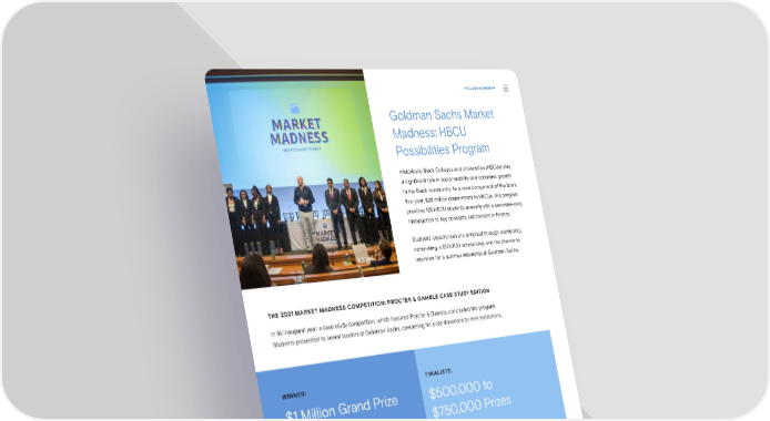 INCLUSIVE GROWTH Goldman Sachs Market Madness: HBCU Possibilities Program Historically Black Colleges and Universities (HBCUs) play a signi昀椀cant role in social mobility and economic growth in the Black community. As a core component of the 昀椀rm’s 昀椀ve-year, $25 million commitment to HBCUs, this program provides 125 HBCU students annually with a semester-long introduction to key concepts and careers in 昀椀nance. Students’ experiences are enriched through mentorship, networking, a $10,000 scholarship, and the chance to interview for a summer internship at Goldman Sachs. THE 2021 MARKET MADNESS COMPETITION: PROCTER & GAMBLE CASE STUDY EDITION In its inaugural year, a case study competition, which featured Procter & Gamble, concluded the program. Students presented to senior leaders at Goldman Sachs, competing for prize donations to their institutions. WINNER: FINALISTS: $1 Million Grand Prize $500,000 to Spelman College $750,000 Prizes Morehouse College Prize funding went directly to the competing teams’ Morgan State University HBCUs to support scholarships for future students. North Carolina A&T State University All 125 students received a $10,000 academic stipend. Prizes and stipends were funded in the form of grants to the HBCU partners. Sustainability Report 2021 Inclusive Growth | Leveraging Partnerships 78