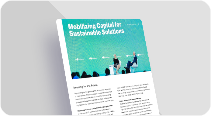 CLIMATE TRANSITION Investing for the Future Beyond insights, the global shift to net zero and expansion based on BNEF estimates of a company’s value attributable of more carbon-e昀케cient resources represents an important to its activities across the clean energy themes of wind investment opportunity. We are committed to developing energy, energy storage, clean power, networks, digitalization, products and solutions that help our clients and investors bioenergy, solar energy, and hydrogen energy. capitalize on the opportunities presented by these changes. Global Environmental Impact Strategy Bloomberg Goldman Sachs Clean Energy Equity Index Goldman Sachs Asset Management has developed an In February 2021, our Asset Management group and investment product that seeks to keep investors on the Bloomberg launched a clean energy equity index, building right side of disruption by moving beyond backward-looking on the strength of our partnership to direct capital and benchmarks to identify innovative, attractively valued utilize data in the 昀椀ght against climate change. We jointly companies aligned with durable secular growth themes. recognize the signi昀椀cant global investments necessary for The product in the US focuses on companies that seek decarbonization — coupled with declining renewable energy to provide solutions to environmental problems aligned costs and ever-increasing technologies for renewable with 昀椀ve key themes: clean energy, resource e昀케ciency, energy. We developed the index using a proprietary sustainable consumption, the circular economy, and water approach informed by insights from BloombergNEF sustainability. (BNEF) analysts, who identify companies that are active and impactful in their respective sectors as well as assess their exposure to clean energy. This data-driven approach Global thematic environmental equity-focused strategies topped $1 billion AUS in 2021. selects securities from the broader Bloomberg World Index, Sustainability Report 2021 Climate Transition | Mobilizing Capital 35