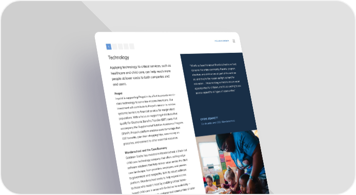 INCLUSIVE GROWTH 1 Technology Applying technology to critical services, such as “What’s so beautiful about Wonderschool is we truly healthcare and child care, can help reach more do serve the entire community. Parents, program people at lower costs to both companies and directors, and children are all part of the work we end users. do, and they’re the reason we 昀椀ght so hard for education. … We’re working so hard to ensure equal Propel opportunities for children, and it’s so exciting to see Imprint is supporting Propel in its e昀昀ort to provide world- access expand for all types of communities.” class technology to serve low-income Americans. Our investment will contribute to Propel’s mission to remove systemic barriers to 昀椀nancial services for marginalized populations. With a focus on supporting individuals that qualify for Electronic Bene昀椀ts Transfer (EBT) cards that accompany the Supplemental Nutrition Assistance Program CHRIS BENNETT (SNAP), Propel’s platform enables users to manage their Co-founder and CEO, Wonderschool EBT bene昀椀ts, plan their shopping trips, save money on groceries, and connect to other essential resources. Wonderschool and the Care Economy Goldman Sachs has invested in Wonderschool, a Black-led child care technology company that o昀昀ers cutting-edge software solutions that help deliver value across the child care landscape, from providers, employers, and parents to government and nonpro昀椀ts. With its robust software platform, Wonderschool seeks to help expand access to those who need it most by enabling critical home- based child care in areas with limited or no availability — particularly in chronically underserved communities of color and among low-income families. Sustainability Report 2021 Inclusive Growth | De昀椀ning and Executing on Our Strategy 65