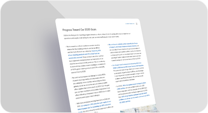 CLIMATE TRANSITION Progress Toward Our 2025 Goals 2021 is the 昀椀rst year for reporting progress toward our e昀昀orts. While COVID-19 continued to have an impact on our operations and supply chain during the last year, we remained focused on our commitments. • We increased our e昀昀orts to advance smarter sourcing • We continue to maintain carbon neutrality for Scope choices for the cleaning products used in our o昀케ces 1, Scope 2, and Scope 3 business travel emissions, and and the food o昀昀ered in our cafeterias. Currently, 40% we neutralized these emissions through a combination of of our cleaning products and 21% of our food are carbon removal and avoidance o昀昀set credits. We intend to sustainably sourced. These products are either certi昀椀ed continue working with our investment team to increase our by an approved standard or meet outlined criteria to be sourcing of carbon removal credits each year as we work classi昀椀ed as environmentally preferred. We are continuing toward phasing out carbon avoidance o昀昀sets by 2030. to work with key vendors toward meeting our commitment of 100% green cleaning products and 50% sustainably • Our Scope 1 and 2 emissions increased by 60% from sourced food by 2025. 2020 to 2021 but are 25% lower than our 2017 baseline. This year-over-year change re昀氀ects an increase in activity • We continue to progress our strategy to remove 100% as our people began to return to o昀케ces, and challenges of plastic beverage bottles and disposables from on- in sourcing market-matched renewable energy in certain site cafeterias, micro-markets, and vending machines locations, speci昀椀cally Singapore. We continue to seek globally, as well as reduce the amount of 昀椀rm-provided opportunities for further reductions. o昀케ce supplies that contain plastic by 2025. Over the past year, we have reverted to compostable disposables in our • As of 2021, 74% of our global square footage has been o昀케ces following a temporary hiatus in 2020 due to health LEED certi昀椀ed. All newly certi昀椀ed facilities are LEED concerns and supply chain challenges. Gold or equivalent, with the exception of two LEED Silver certi昀椀ed properties that had leases signed prior to 2021. • With many employees working from home in 2020 and Also, 100% of our facilities continue to be ISO 14001 2021, we achieved a 79% reduction per-capita on our certi昀椀ed, and all our on-site events continue to be 100% internal paper use, far exceeding our 30% reduction ISO 20121 certi昀椀ed. target. We will continue to monitor paper use in o昀케ces as our sta昀昀 fully returns to o昀케ces. • In 2021, the energy and water intensity of our o昀케ces decreased by 36% and 42%, respectively, from a 2017 baseline. As a result, we have already exceeded our energy intensity target of 20% reduction and our water intensity target of 15% reduction by 2025. We will be closely monitoring performance of these metrics as sta昀昀 fully returns to our o昀케ces. • We continue to procure 100% renewable energy for all of our global electricity consumption — and work toward our commitment to have 80% of this from long-term contracts. Sustainability Report 2021 Climate Transition | Driving Sustainability in Our Own Business 44