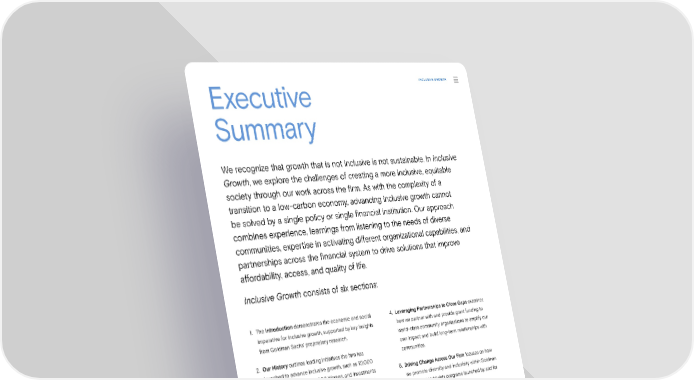 Executive INCLUSIVE GROWTH Summary We recognize that growth that is not inclusive is not sustainable. In Inclusive Growth, we explore the challenges of creating a more inclusive, equitable society through our work across the 昀椀rm. As with the complexity of a transition to a low-carbon economy, advancing inclusive growth cannot be solved by a single policy or single 昀椀nancial institution. Our approach combines experience, learnings from listening to the needs of diverse communities, expertise in activating di昀昀erent organizational capabilities, and partnerships across the 昀椀nancial system to drive solutions that improve a昀昀ordability, access, and quality of life. Inclusive Growth consists of six sections: 1. The Introduction demonstrates the economic and social 4. Leveraging Partnerships to Close Gaps examines imperative for inclusive growth, supported by key insights how we partner with and provide grant funding to from Goldman Sachs’ proprietary research. world-class community organizations to amplify our own impact and build long-term relationships with 2. Our History outlines leading initiatives the 昀椀rm has communities. launched to advance inclusive growth, such as 10,000 Small Businesses and 10,000 Women, and investments 5. Driving Change Across Our Firm focuses on how led by our Urban Investment Group. Within this section, we promote diversity and inclusivity within Goldman One Million Black Women highlights how all of the lessons Sachs and highlights programs launched by and for learned throughout our history of investing in underserved our own people. communities have culminated in our latest signature inclusive growth initiative, which focuses on increasing 6. What to Expect Next gives a sense of the work to opportunity at key moments in Black women’s lives. come, including the ways in which we continue to take a holistic, interconnected approach to our work 3. De昀椀ning and Executing on Our Strategy illustrates on climate transition and inclusive growth. the ways we are leveraging the breadth of our business and commercial capabilities to help expand access, lower costs, and improve outcomes. Sustainability Report 2021 Inclusive Growth | Executive Summary 49