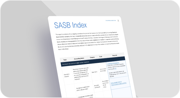 SASB Index KEY METRICS & INDICATORS This report is evidence of our ongoing commitment to provide disclosures under the Sustainability Accounting Standards Board (SASB) standards. We have included the below disclosures related to the three sectors that are most closely aligned to our mix of businesses: Asset Management and Custody Activities, Investment Banking and Brokerage, and Commercial Banks. Disclosures that appeared in more than one of these sector standards are included in a separate section at the top. Unless otherwise noted, all data and descriptions apply to our entire 昀椀rm, not just the businesses relevant to that sector. We do not currently disclose all metrics included in the standards for these three sectors, but we will continue to evaluate them in the future. Topic Accounting Metric Category Code Response Disclosures included in multiple sectors’ standards US Workforce Demographics Percentage of gender and racial/ As part of our commitment to improving ethnic group representation for FN-AC-330a.1 diversity at the 昀椀rm, we have also published Diversity & (1) executive management, (2) Quantitative FN-IB-330a.1 diversity goals here. Inclusion non-executive management, (3) professionals, and (4) all other We plan to share further details in our employees People Strategy report, to be published in May 2022. FN-AC-510a.2 Description of whistleblower Discussion FN-IB-510a.2 Raising Integrity Concerns policies and procedures and Analysis FN-CB- Code of Business Conduct and Ethics 510a.2 Total amount of monetary losses as a result of legal proceedings associated with: • Marketing and communication Business of 昀椀nancial product-related Ethics information to new and FN-AC- returning customers; 270a.2 • Fraud, insider trading, anti- FN-AC-510a.1 During 2021, our total net provisions for all trust, anti-competitive Quantitative FN-IB-510a.1 litigation and regulatory proceedings were behavior, market manipulation, FN-IB-510b.3 $534 million. malpractice, or other related FN-CB-510a.1 昀椀nancial industry laws or regulations; and • Professional integrity, including duty of care SSuussttaaiinnaabbiilliittyy Re Reppoorrtt 2 2002121 KKeey My Meettrriiccs & Is & Innddiiccatatoorrs | Ss ASB Index 100