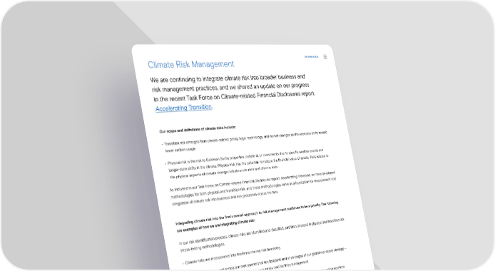 Climate Risk Management GOVERNANCE We are continuing to integrate climate risk into broader business and risk management practices, and we shared an update on our progress in the recent Task Force on Climate-related Financial Disclosures report, Accelerating Transition. Our scope and de昀椀nitions of climate risks include: • Transition risk emerges from climate-related policy, legal, technology, and market changes as the economy shifts toward lower carbon usage. • Physical risk is the risk to Goldman Sachs properties, collateral, or investments due to speci昀椀c weather events and longer-term shifts in the climate. Physical risk has the potential to reduce the 昀椀nancial value of assets. Risks related to the physical impacts of climate change include acute risks and chronic risks. As included in our Task Force on Climate-related Financial Disclosures report, Accelerating Transition, we have developed methodologies for both physical and transition risk, and these methodologies serve as a foundation for measurement and integration of climate risk into business and risk processes across the 昀椀rm. Integrating climate risk into the 昀椀rm’s overall approach to risk management continues to be a priority. The following are examples of how we are integrating climate risk: In our risk identi昀椀cation process, climate risks are identi昀椀ed and classi昀椀ed, and then stressed in physical and transition risk stress-testing methodologies. • Climate risks are incorporated into the 昀椀rm’s internal risk taxonomy. • Physical risk is assessed across our own operational risk footprint and at all stages of our global real estate strategy — from site selection and building design through occupancy and facilities management. • We also assess physical risk for the 昀椀rm’s real estate positions, including equity investments and lending positions. • As we integrate climate risk into broader risk management, we have begun incorporating climate risk into credit evaluations and underwriting processes for select transactions, including considering climate risk factors and mitigants. • As appropriate, we are integrating climate risk considerations into appropriate frameworks and policies. Sustainability Report 2021 Governance | 2021 Transaction Breakdown and Highlights 92