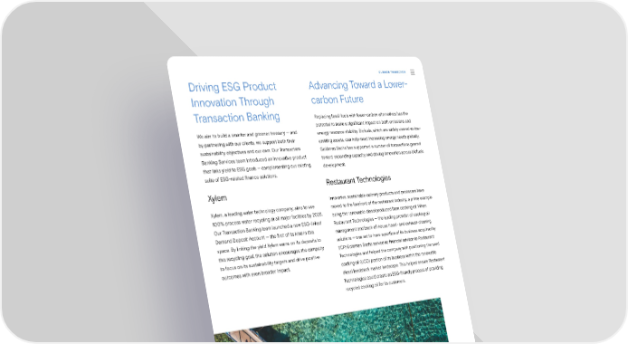 CLIMATE TRANSITION Driving ESG Product Advancing Toward a Lower- Innovation Through carbon Future Transaction Banking Replacing fossil fuels with lower-carbon alternatives has the potential to make a signi昀椀cant impact on both emissions and We aim to build a smarter and greener treasury — and energy resource stability. Biofuels, which are widely viewed as low- by partnering with our clients, we support both their emitting assets, can help meet increasing energy needs globally. sustainability objectives and our own. Our Transaction Goldman Sachs has supported a number of transactions geared Banking Services team introduced an innovative product toward expanding capacity and driving innovation across biofuels that links yield to ESG goals — complementing our existing development. suite of ESG-related 昀椀nance solutions. Xylem Restaurant Technologies Innovative, sustainable culinary products and processes have Xylem, a leading water technology company, aims to use moved to the forefront of the restaurant industry, a prime example 100% process water recycling at all major facilities by 2025. being the renewable diesel produced from cooking oil. When Our Transaction Banking team launched a new ESG-linked Restaurant Technologies — the leading provider of cooking oil Demand Deposit Account — the 昀椀rst of its kind in this management and back-of-house hood- and exhaust-cleaning space. By linking the yield Xylem earns on its deposits to solutions — was set to have a portion of its business acquired by this recycling goal, the solution encourages the company ECP, Goldman Sachs served as 昀椀nancial advisor to Restaurant to focus on its sustainability targets and drive positive Technologies and helped the company with positioning the used outcomes with even broader impact. cooking oil (UCO) portion of its business within the renewable diesel feedstock market landscape. This helped ensure Restaurant Technologies could create an ESG-friendly process of providing recycled cooking oil for its customers. Sustainability Report 2021 Climate Transition | Driving Transition 22