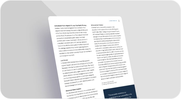 CLIMATE TRANSITION ActiveBeta® Paris-Aligned US Large Cap Equity Strategy NN Investment Partners Goldman Sachs Asset Management has launched a Paris- Goldman Sachs announced the completion of the aligned investment strategy that seeks to align with the goals acquisition of NN Investment Partners from NN Group N.V. of the Paris Climate Agreement to combat climate change for €1.7 billion. With a heritage dating back almost 175 years, and its e昀昀ects. The purpose of our Paris-aligned investment NN Investment Partners is a leading sustainable investment approach is to decarbonize public equity investment manager in Europe. NN Investment Partners will be integrated portfolios and increase investment in climate solutions in into Goldman Sachs Asset Management with the company’s a way that is consistent with a 1.5°C net zero emissions more than 900 professionals joining the Goldman Sachs future, in line with the stated goals of the Paris Agreement. family. The Netherlands is now an important location in The strategy supports many investors’ growing desire to Goldman Sachs’ European business and a center of reduce carbon emissions and more deliberately manage the excellence for sustainability in public markets investing. The transition to a low-carbon economy through our rules-based acquisition brings Goldman Sachs’ assets under supervision and transparent approach. to approximately $2.8 trillion1 and affirms its position as a top 昀椀ve active asset manager globally with leading franchises in Just Climate 昀椀xed income, liquidity, equities, alternatives and insurance In October 2021, Goldman Sachs Asset Management asset management. NN Investment Partners has been Imprint (“Imprint”) announced its strategic partnership with successful in incorporating Environmental, Social and Generation IM in the foundation of Just Climate. The mission Governance (ESG) factors across its product range, with ESG of Just Climate is to limit the global temperature rise to 1.5°C criteria integrated into approximately 90% of assets under by catalyzing and scaling capital toward the most impactful 2. Over time, Goldman Sachs Asset Management supervision climate solutions. Our Asset Management group served intends to leverage the expertise of NN Investment Partners as a founding strategic partner in Just Climate alongside to complement its existing investment processes, helping the Microsoft Climate Innovation and Development Fund, Ireland 昀椀rm to deepen ESG integration across its product range and Strategic Investment Fund (ISIF), IMAS Foundation, and deliver on clients’ sustainable investing priorities. Harvard Management Company. 1—All data as of December 2021. Structured Notes Issuance 2—NN Group: “N.V. Annual Report 2021.” Our structured note issuance in the sustainable space has risen by more than 50% in the past year, with demand continuing to grow as retail investors become increasingly concerned with integrating ESG into their 昀椀nancial “This acquisition advances our investments on indices that can 昀椀lter and re昀氀ect ESG considerations. French accounts led the European demand commitment to put sustainability at the for products linked to third-party ESG indices, and we’re heart of our investment platform. We starting to gauge growing interest from the APAC region. are excited to welcome the talented While sector exclusions and absolute scores remain popular, team at NN Investment Partners, a there has been a wider variety of approaches used by center of excellence in sustainable clients as they seek out improvers in this space. To help meet the increasing demand for environmental and climate- investing, to Goldman Sachs and related products, S&P launched a range of indices that together we will focus on delivering were exclusive to Goldman Sachs and designed to meet long-term value to our clients and Paris Aligned Benchmark and Climate Aligned Benchmark shareholders.” requirements. DAVID SOLOMON Sustainability Report 2021 Chairman and Chief Executive O昀케cer, Climate Transition | Mobilizing Capital Goldman Sachs 36