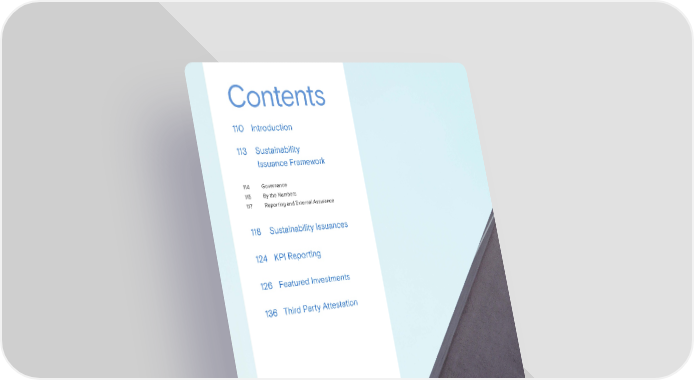 Contents 110 Introduction 113 Sustainability Issuance Framework 114 Governance 115 By the Numbers 117 Reporting and External Assurance 118 Sustainability Issuances 124 KPI Reporting 126 Featured Investments 136 Third Party Attestation 1092