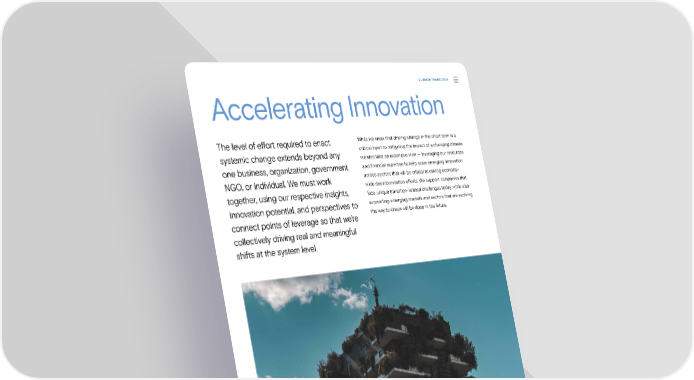 CLIMATE TRANSITION Accelerating Innovation The level of e昀昀ort required to enact While we know that driving change in the short term is a systemic change extends beyond any critical input to mitigating the impact of a changing climate, we also take an expansive view — leveraging our resources one business, organization, government, and 昀椀nancial expertise to help scale emerging innovation NGO, or individual. We must work across sectors that will be critical to driving economy- wide decarbonization e昀昀orts. We support companies that together, using our respective insights, face unique transition-related challenges today, while also innovation potential, and perspectives to supporting emerging markets and sectors that are evolving connect points of leverage so that we’re the way business will be done in the future. collectively driving real and meaningful shifts at the system level. Sustainability Report 2021 Climate Transition | Accelerating Innovation 27