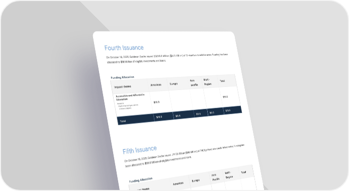 Fourth Issuance On October 14, 2021, Goldman Sachs issued SGD19.6 Million ($14.5 Million) of 15-month autocallable notes. Funding has been allocated to $18 Million of eligible investments and loans. Funding Allocation Impact theme Americas Europe Asia Multi- Total pacific Region Accessible and Affordable Education Related to: $18.0 $18.0 · Platform facilitating educational childcare programs Total $18.0 $0.0 $0.0 $0.0 $18.0 Fifth Issuance On October 18, 2021, Goldman Sachs issued JPY7.5 Billion ($66 Million) of 7NC6yr 昀椀xed rate credit-linked notes. Funding has been allocated to $68.6 Million of eligible investments and loans. Funding Allocation Impact theme Americas Europe Asia Multi- Total Pacific Region Communities Related to: · 100% a昀昀ordable, senior housing and multi-family housing projects, some serving formerly homeless seniors¹ $63.6 $5.0 $68.6 · Housing developer serving people with disabilities · Outsourced business processing company committed to business and job creation in underserved communities Total $63.6 $0.0 $5.0 $0.0 $68.6 ¹Affordable housing is defined in this context as housing that is affordable to tenants earning up to 80% of the area median income. For additional details on eligibility criteria associated with relevant green and social project categories, please refer to our Sustainability Issuance Framework (p. 2-6) Sustainability Report 2021 Sustainability Issuance Report | Sustainability Issuances 122