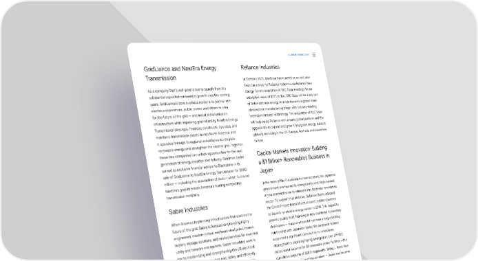 CCLLIIMMAATTEE TR TRAANNSSIITITIOONN GridLiance and NextEra Energy Reliance Industries Transmission In October 2021, Goldman Sachs acted as an exclusive As a company that’s well-positioned to bene昀椀t from the 昀椀nancial advisor to Reliance Industries on Reliance New substantial expected renewables growth over the coming Energy Solar’s acquisition of REC Solar Holdings for an years, GridLiance’s core business model is to partner with enterprise value of $771 million. REC Solar will be a key part electric cooperatives, public power, and others to plan of Reliance’s new energy vision to become a global-scale for the future of the grid — and invest in transmission photovoltaic manufacturing player with industry-leading infrastructure while improving grid reliability. NextEra Energy heterojunction cell technology. The acquisition of REC Solar Transmission develops, 昀椀nances, constructs, operates, and will help equip Reliance with a ready global platform and the maintains transmission assets across North America, and opportunity to expand and grow in key green energy markets it operates through its regional subsidiaries to integrate globally, including in the US, Europe, Australia, and elsewhere renewable energy and strengthen the electric grid. Together, in Asia. these two companies can unlock opportunities for the next Capital Markets Innovation: Building generation of energy creation and delivery. Goldman Sachs served as exclusive 昀椀nancial advisor to Blackstone in its a $1 Billion+ Renewables Business in sale of GridLiance to NextEra Energy Transmission for $660 Japan million — including the assumption of debt — which furthered NextEra’s goal to create America’s leading competitive In the wake of the Fukushima nuclear accident, the Japanese transmission company. government overhauled its energy policy and implemented Sabre Industries a new renewables law to stimulate the Japanese renewables sector. To support that initiative, Goldman Sachs adapted the Green Project Bond Structure used in other countries When it comes to planning infrastructure that enables the to Japan’s renewable energy sector in 2013. This helped to future of the grid, Sabre is focused on providing highly provide quality debt 昀椀nancing to non-traditional renewables engineered, mission-critical overhead steel poles, towers, developers — many of whom did not have a long-standing battery storage solutions, and related services for electrical relationship with Japanese banks. We are proud to have utility and telecom end markets. Sabre Industries’ work is supported a signi昀椀cant contribution to renewables key to modernizing and strengthening the US electrical deployment in Japan by having arranged an over JPY100 transmission and distribution grid, safely and e昀케ciently billion bond issuance for 86 renewable power facilities with a interconnecting rapidly growing renewable generation cumulative capacity of 338.9 megawatts. Today — more than capacity and battery storage facilities, and expanding ten years after the Fukushima accident — Japan has become 4G and 5G wireless telecom infrastructure for enhanced a world leader in renewables deployment. network reliability and connectivity. In 2021, Goldman Sachs provided 昀椀nancing of $1 billion to Blackstone Energy Partners in its acquisition of Sabre Industries, continuing In addition, Goldman Sachs served as sole arranger on Blackstone’s focus on investing in companies that support Canadian Solar’s JPY8.1 billion ($75 million) green project the transition to cleaner, more a昀昀ordable energy. bond that combines a dual tenor structure with a multi- asset cross-collateralization scheme to 昀椀nance three solar projects in Japan, with a peak combined generating capacity of 43MW. The bond was awarded the highest “Green 1” rating under the Japanese Green Bond guidelines by the Japan Credit Rating Agency and also won green Project Bond of the Year as part of Environmental Finance’s Bond Awards 2022. Sustainability Report 2021 Climate Transition | Accelerating Innovation 31
