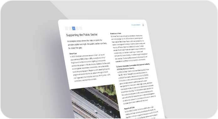 INCLUSIVE GROWTH 3 Supporting the Public Sector Rumichaca-Pasto Goldman Sachs was joint global coordinator, bookrunner, In complex areas where the risks or costs for and lead arranger on the $798 million-equivalent project private capital are high, the public sector can help 昀椀nancing for Rumichaca-Pasto, a toll road connecting the to close the gap. border crossing point between Colombia and Ecuador, with the city of Pasto, Colombia. Estimated to serve 7 million Smart Luz people, Rumichaca-Pasto will expand a major commercial In 2021, Brazilian subconcessionare Smart Luz issued route to help rural farmers reach larger markets and approximately $163 million in BRL-denominated 144a/ stimulate the local economy, in addition to generating travel- RegS bonds to 昀椀nance a street lighting public-private time savings. The transaction represents the largest social partnership project in Rio de Janeiro. Goldman Sachs acted bond tied to an infrastructure project in Latin America. as sole global coordinator, bookrunner, and sustainability California Statewide Communities Development Authority bond structuring agent. Beginning with street lighting, the (CSCDA) Workforce Housing project will modernize Rio de Janeiro through a “smart In 2021, Goldman Sachs Investment Banking raised more city” approach that includes cameras, Wi-Fi points, tra昀케c than $2.7 billion through 12 separate transactions for controllers, and manhole sensors. a CSCDA Community Improvement Authority (CSCDA CIA) public-private partnership program that utilizes governmental ownership and private sector asset management to create and sustain high-quality, a昀昀ordable housing for middle-income earners (also known as essential or workforce housing). This transaction series included the 昀椀rst social bond issuance in the essential housing sector, and each of the 12 transactions were ultimately designated social bonds pursuant to a social bond framework, which the Goldman Sachs team crafted with the issuer. Republic of Chile In July 2021, Goldman Sachs led a $5.8 billion multi- tranche and multi-currency social bond o昀昀ering for the Republic of Chile in support of the government’s COVID-19 relief package. The bond o昀昀ering represented the fourth consecutive transaction Goldman Sachs led for the Republic of Chile in 2021 (amounting to more than $9 billion in proceeds) — and further cemented Chile as the most active sovereign issuer of ESG bonds in Latin America. Chile intends to invest proceeds from the social bonds into projects that may qualify as eligible social expenditures under Chile’s Sustainable Bond Framework. Sustainability Report 2021 Inclusive Growth | De昀椀ning and Executing on Our Strategy 68