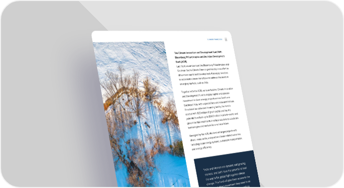 CLIMATE TRANSITION The Climate Innovation and Development Fund With Bloomberg Philanthropies and the Asian Development Bank (ADB) Last April, we announced the Bloomberg Philanthropies and Goldman Sachs Climate Finance partnership in an e昀昀ort to drive more capital and develop tools that equip investors to accelerate climate transition and address the needs in emerging markets, such as Asia. Together with the ADB, we launched the Climate Innovation and Development Fund to deploy capital and catalyze investment in clean energy projects across South and Southeast Asia, with a special focus on India and Vietnam. Structured as a blended 昀椀nancing facility, the fund is seeded with $25 million of grant capital and has the potential to unlock up to $500 million in private-sector and governmental investments in critical solutions to accelerate technologies and markets for a net zero future. Managed by the ADB, the fund will target projects with direct, measurable, and positive climate-related outcomes, including clean energy systems, sustainable transportation, and energy e昀케ciency. “India and Vietnam are dynamic and growing markets, and both have the potential to lead the way in the global 昀椀ght against climate change. This fund will give them access to the capital and direct investment they need to do just that, and I’m looking forward to working with our partners at Goldman Sachs and the Asian Development Bank as we expand our e昀昀orts in the region and help other countries do the same.” MICHAEL R. BLOOMBERG Founder, Bloomberg LP and Bloomberg Philanthropies Sustainability Report 2021 Climate Transition | Closing the Gap Through Partnerships 3838
