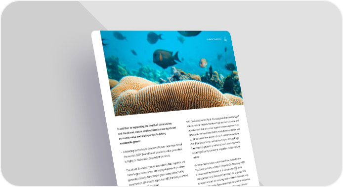 CLIMATE TRANSITION In addition to supporting the health of communities with the Conservation Fund. We recognize the importance of and the planet, nature and biodiversity have signi昀椀cant critical natural habitats that have high biodiversity value and economic value and are important to driving include areas that are under legal or proposed government sustainable growth: protection. We have established related environmental and social risk guidelines as part of our 昀椀rmwide transactional • According to the World Economic Forum, more than half of due diligence process, and we have committed to forgo the world’s GDP, $44 trillion of economic value generation, 昀椀nancing any projects or initiating loans where proceeds is highly or moderately dependent on nature. would signi昀椀cantly convert or degrade a critical natural habitat. • The World Economic Forum also reports that, together, the three largest sectors that are highly dependent on nature Goldman Sachs is also a member of the forum for the generate close to $8 trillion of gross value added (GVA): Taskforce on Nature-related Financial Disclosures (TNFD), construction ($4 trillion), agriculture ($2.5 trillion), and food a new market-led initiative that aims to develop a risk and beverages ($1.4 trillion)1. management and disclosure framework for organizations to report and act on evolving nature-related risks and help For these reasons, Goldman Sachs remains committed to shift global 昀椀nancial 昀氀ows toward nature-positive outcomes. the global e昀昀ort to protect the world’s forests and oceans Building on the momentum of the Taskforce on Climate- and seeks to act responsibly when 昀椀nancing or investing in Related Financial Disclosures (TCFD) framework, we believe companies or projects in sectors that have potential impact that quality, reliable information on biodiversity and nature- on nature and biodiversity across both terrestrial and marine related impacts, facilitated by better disclosure, will allow ecosystems. corporations and 昀椀nancial institutions to better understand Goldman Sachs has a long history of protecting nature and and measure nature-related impacts and ultimately biodiversity, from our conservation e昀昀orts establishing the incorporate nature-related risks and opportunities into Karukinka preserve in Tierra del Fuego to our recent work strategic planning and risk management. 1—World Economic Forum: “Nature Risk Rising: Why the Crisis Engul昀椀ng Nature Matters for Business and the Economy,” January 2020. Sustainability Report 2021 Climate Transition | Looking Ahead 47