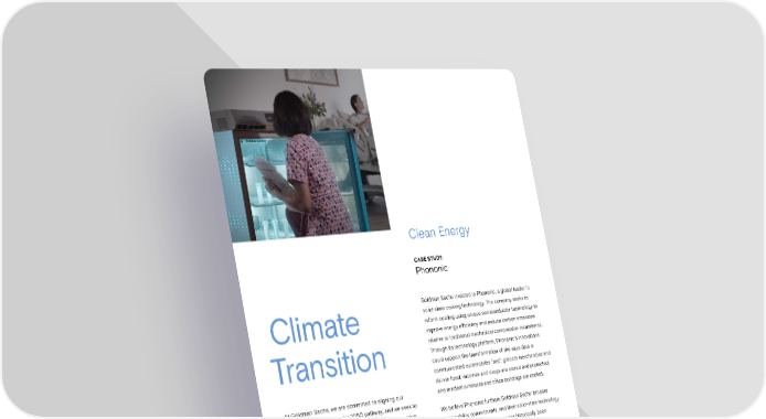 Clean Energy CASE STUDY: Phononic Goldman Sachs invested in Phononic, a global leader in solid-state cooling technology. The company seeks to Climate reform cooling using unique semiconductor technology to improve energy e昀케ciency and reduce carbon emissions relative to traditional mechanical compression incumbents. Transition Through its technology platform, Phononic’s innovations could support the transformation of the ways data is communicated; automobiles "see"; grocers merchandise and deliver food; vaccines and drugs are stored and protected; At Goldman Sachs, we are committed to aligning our and residential houses and o昀케ce buildings are cooled. business with a net zero by 2050 pathway, and we seek to drive decarbonization in the real economy, in partnership We believe Phononic furthers Goldman Sachs’ broader with our clients and companies that we invest in. Meeting sustainability commitments, and their solid-state technology the goals of the Paris Agreement and preventing the worst is delivering solutions that have not historically been available through legacy thermoelectric or compressor impacts of climate change will require capital, innovation, and coordination across both the public and private sector incumbents. Our investment aims to help grow and expand as businesses across regions and sectors seek to implement their capabilities to meet anticipated demand. low-carbon solutions — and communities everywhere adapt to an increasingly warming world. Phononic’s technology and products are important to the way we communicate; feed our families; safeguard and transport life-saving vaccines; and even shop for our favorite ice cream snacks. We believe that this investment is an important example of how innovation and capital can together help support transformative environmental impact. Sustainability Report 2021 Sustainability Issuance Report | Featured Investments 127