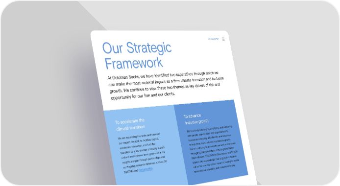 Our Strategic INTRODUCTION Framework At Goldman Sachs, we have identi昀椀ed two imperatives through which we can make the most material impact as a 昀椀rm: climate transition and inclusive growth. We continue to view these two themes as key drivers of risk and opportunity for our 昀椀rm and our clients. To accelerate the To advance climate transition inclusive growth We are expanding the scale and speed of We’re actively listening to, amplifying, and partnering our impact. We look to mobilize capital, with people, communities, and organizations to accelerate innovation, and fuel the improve accessibility, a昀昀ordability, and outcomes transition to a low-carbon economy at both to help drive more inclusive, sustainable growth. a client and systemic level, grounded in the We’re continuing to accelerate our work in this space insights we gain through partnerships and through signature initiatives, including One Million our 昀氀agship research initiatives, such as GS Black Women, 10,000 Small Businesses, and 10,000 SUSTAIN and Carbonomics. Women. We acknowledge that long-term outcomes will be the true test of our impact in helping to build a more diverse, equitable, and inclusive economy. We also remain focused on the growing impacts of climate change on sustainable, inclusive economic What We’ve Learned growth. We remain steadfast in our belief that growth Synergies between climate transition and inclusive growth: that is not inclusive is not sustainable, and we remain • Complex, large-scale challenges require interconnected, committed to supporting an inclusive transition. Our dynamic, and scalable solutions. work here is just beginning, and we will continue to • Working with clients, partners, and our people ampli昀椀es our impact. report on our areas of focus and impact in this space. Sustainability Report 2021 Introduction 8