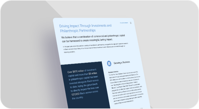 Driving Impact Through Investments and IINCNCLLUUSSIIVEVE G GRROOWWTTHH Philanthropic Partnerships We believe that a combination of commercial and philanthropic capital can be harnessed to create meaningful, lasting impact. In the past year, we’ve focused on a variety of investments, partnerships, and grants that align with important moments in Black women’s lives. Many of our focus areas for these investments and initiatives were identi昀椀ed through our listening sessions. Growing a Business Over $870 million of investment capital and more than $9 million Grameen America in philanthropic capital has been For the 昀椀rst time, Goldman Sachs has provided capital for invested alongside Black women microloans through a new partnership with Grameen. Our to date, laying the groundwork $20 million loan will help 昀椀nance small business loans to low- income Black women entrepreneurs as part of Grameen’s to directly impact the lives over new “Elevating Black Women Entrepreneurs” initiative 107,000 Black women across “Elevate.” Launched in May 2021, “Elevate” is a dedicated the country. program that will o昀昀er loan capital, technical assistance, and 昀椀nancial coaching to Black women small business owners. Grameen will partner with local organizations on outreach and recruitment, as well as tailor and strengthen its business and 昀椀nancial education programming to better meet the needs of Black women entrepreneurs. Collab Capital We invested in Collab Capital, an early-stage venture “This signi昀椀cant partnership with Goldman Sachs’ capital fund investing in Black founders. Collab Capital One Million Black Women will meaningfully address seeks to address the lack of capital access for Black funding gaps faced by emerging Black women entrepreneurs; currently, approximately 1% of venture entrepreneurs. By engaging with and directly capital goes to Black-founded companies while Black lending to communities of color, we are making Americans represent 14% of the US population. Collab 昀椀nancial inclusion a reality for tens of thousands of Capital also looks to optimize 昀椀nancial and social capital Black women now and far into the future.” to help Black founders build pro昀椀table and sustainable businesses, investing in tech and tech-enabled companies working on innovative solutions in niche or growth markets. ALETHIA MENDEZ Division President for Elevating Black Women SSSuuussstttaaaiiinnnaaabbbiiillliiitttyyy Re Re Repppooorrrttt 2 2 2000212121 IIInnncccllluuusssiiive Gve Gve Grrrooowwwttth | Oh | Oh | Onnne Me Me Miiilllllliiiooon Bn Bn Blllaaaccck Wk Wk Wooommmeeennn 575757 Entrepreneurs, Grameen America
