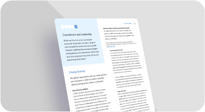 INCLUSIVE GROWTH 5 Goldman Sachs Asset Management Stewardship Our Global Stewardship Team seeks to promote best Commitment and Leadership practices in ESG and corporate governance at portfolio companies through proxy voting, direct engagement, and Within our 昀椀rm and across our broader industry collaboration. ecosystem of partners, we have a range of For more information on how Goldman Sachs Asset Management tools designed to advance inclusive growth. engages with hundreds of companies around the world, please review our However, mobilizing these resources begins Stewardship Report. with leadership and commitment, which allow Promoting Board Diversity us to drive progress in key areas with an aim We use our voice as shareholders through proxy voting — toward long-term impact. encouraging greater levels of board diversity at our portfolio companies. Since 2019, we voted against directors at all-male boards in the US, and we are pleased to see that 68% of the 250 companies we voted against in 2019 have since added at least one woman director¹. In 2020, we made our approach Driving Diversity global and voted against 898 companies for not having at least one woman director. Twenty-seven percent of these companies We identify opportunities with our clients, partners, now have at least one woman director². and companies in which we invest to prioritize In 2021, we updated our US proxy voting policy to consider diversity among teams, brokers, and boards. the composition of boards across race, ethnicity, and sexual orientation, as well as gender, while globally we continued to Board Diversity Initiative push for gender representation. We voted against directors at In 2020, we announced that we would take a company 1,172 companies in 2021 due to lack of board diversity. public in the US or Western Europe only if it had at Trader Interactive least one diverse board member, founded on the belief In 2017, Goldman Sachs Private Equity group saw an opportunity that diverse leadership at companies leads to stronger to support Virginia-based Trader Interactive in its mission to performance and better governance. Building on that digitalize the search and purchase of non-automobile motor commitment, we increased this requirement last year to two vehicles through its online marketplaces. At this time, Trader diverse board members, one of whom must be a woman. Interactive — led by CEO Lori Stacy — was already a diverse We have helped facilitate more than 50 diverse board company, with 43% of leadership positions held by women placements across our clients. (compared to the average 11% in senior leadership roles within 3 technology and media ). Aligned on the importance of diversity As part of this initiative, we continue to elevate diverse talent in ideas and perspectives, Goldman Sachs has, over the years, through our networks in the 昀椀rm, including individuals with advised on recruiting candidates with diverse backgrounds at relationships across Investment Banking, Private Wealth the executive level, while Trader Interactive prioritized diversity, Management, and Ayco as potential candidates, in addition equity, and inclusion to di昀昀erentiate their company as the to external networks. employer of choice and as an innovator in the traditionally male-dominated vehicle and technology sector. By creating an inclusive workplace with 83% diversity at the executive level, Trader Interactive bene昀椀ts from an engaged employee base — resulting in more stimulating discussions, increased innovation, and less turnover. 1, 2—Figures as of December 31, 2021. 3—McKinsey & Company: “Closing the tech gender gap through philanthropy and corporate social responsibility.” September 2018. Sustainability Report 2021 Inclusive Growth | De昀椀ning and Executing on Our Strategy 70