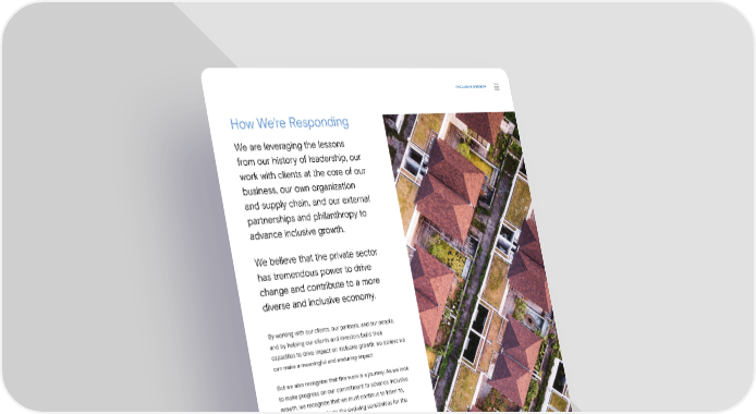 INCLUSIVE GROWTH How We’re Responding We are leveraging the lessons from our history of leadership, our work with clients at the core of our business, our own organization and supply chain, and our external partnerships and philanthropy to advance inclusive growth. We believe that the private sector has tremendous power to drive change and contribute to a more diverse and inclusive economy. By working with our clients, our partners, and our people, and by helping our clients and investors build their capacities to drive impact on inclusive growth, we believe we can make a meaningful and enduring impact. But we also recognize that this work is a journey. As we look to make progress on our commitment to advance inclusive growth, we recognize that we must continue to listen to, learn from, and navigate the evolving sensitivities for the di昀昀erent communities in which we serve. Sustainability Report 2021 Inclusive Growth | Introduction 51