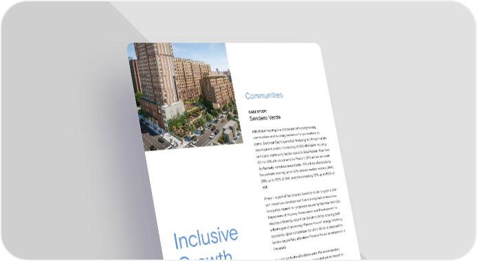 Communities CASE STUDY: Sendero Verde A昀昀ordable housing is a critical part of strengthening communities and building resilience for generations to come. Goldman Sachs provided 昀椀nancing for Phase 1 of the development project consisting of 208 a昀昀ordable housing units plus community facility space in East Harlem, New York. Of the 208 a昀昀ordable units in Phase 1, 25% will be set aside for formerly homeless households, 17% will be a昀昀ordable to households earning up to 30% of area median income (AMI), 25% up to 50% of AMI, and the remaining 33% up to 60% of AMI. Phase 1 is part of the broader Sendero Verde project, a 348- unit mixed-use development that is being built in response to a public request for proposals issued by the New York City Department of Housing Preservation and Development to develop a formerly vacant lot. Sendero Verde is being built Inclusive with the goal of achieving “Passive House” energy e昀케ciency standards. Upon completion, Sendero Verde is expected to be the largest fully a昀昀ordable Passive House development in Growth the world. In addition to the a昀昀ordable units, the overall project includes community facility space that will be leased to: We recognize that growth must be inclusive to be sustainable. As with the complexity of a transition to a low- • Harlem Children’s Zone: a local nonpro昀椀t organization carbon economy, the inclusive growth challenge is far from focused on breaking the cycle of intergenerational simple and cannot be solved by a single 昀椀nancial institution. poverty through its charter school and preschool Our approach combines over 20 years of experience programs; and investing in underserved communities, learnings from connecting with and listening to the needs of a wide range of • East Harlem Council for Community Improvement: diverse communities and partnerships to help drive solutions a local nonpro昀椀t organization focused on community that improve a昀昀ordability, access, and quality of life. advocacy and providing supportive services. Sustainability Report 2021 Sustainability Issuance Report | Featured Investments 131