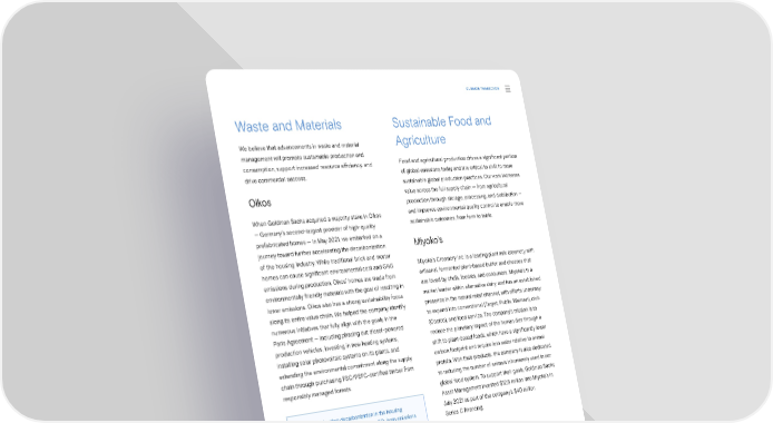CLIMATE TRANSITION Waste and Materials Sustainable Food and We believe that advancements in waste and material Agriculture management will promote sustainable production and consumption, support increased resource e昀케ciency, and Food and agricultural production drives a signi昀椀cant portion drive commercial success. of global emissions today and it is critical to shift to more sustainable global production practices. Our work increases Oikos value across the full supply chain — from agricultural production through storage, processing, and distribution — When Goldman Sachs acquired a majority stake in Oikos and improves environmental quality control to enable more — Germany’s second-largest provider of high-quality sustainable outcomes, from farm to table. prefabricated homes — in May 2021, we embarked on a journey toward further accelerating the decarbonization Miyoko’s of the housing industry. While traditional brick and mortar homes can cause signi昀椀cant environmental cost and GHG Miyoko’s Creamery Inc. is a leading plant milk creamery with emissions during production, Oikos’ homes are made from artisanal, fermented plant-based butter and cheeses that environmentally friendly materials with the goal of resulting in are loved by chefs, foodies, and consumers. Miyoko’s is a lower emissions. Oikos also has a strong sustainability focus market leader within alternative dairy and has an established along its entire value chain. We helped the company identify presence in the natural retail channel, with e昀昀orts underway numerous initiatives that fully align with the goals in the to expand into conventional (Target, Publix, Walmart), club Paris Agreement — including phasing out diesel-powered (Costco), and food service. The company’s mission is to production vehicles, investing in new heating systems, reduce the planetary impact of the human diet through a installing solar photovoltaic systems on its plants, and shift to plant-based foods, which have a signi昀椀cantly lower extending the environmental commitment along the supply carbon footprint and require less water relative to animal chain through purchasing FSC/PEFC-certi昀椀ed timber from protein. With their products, the company is also dedicated responsibly managed forests. to reducing the number of animals inhumanely used in our global food system. To support their goals, Goldman Sachs Asset Management invested $12.5 million into Miyoko’s in Oikos is accelerating decarbonization in the housing July 2021 as part of the company’s $40 million industry with approximately 99% lower CO2/sqm emissions Series C 昀椀nancing. over traditional houses and approximately 80%–90% environmental cost advantage. Nature’s Fynd TemperPack Nature’s Fynd, a food technology company, has developed a new protein that is highly nutritious and contains 51% protein by dry mass and all 20 amino acids used by the human Goldman Sachs Asset Management invested in TemperPack, body. The protein’s structure is versatile, which allows it to a leading manufacturer of sustainable thermal insulation be manufactured into di昀昀erent form factors across meat and for cold chain packaging. The new funding will expand dairy. Nature’s Fynd’s protein production is more resource- TemperPack’s capacity for protective materials technologies, e昀케cient than that of other proteins, such as soy and pea grow its geographic footprint, and extend its customer reach isolates, with a lower cost at scale, enabling it to produce the — helping to keep plastic waste out of the environment and protein with a fraction of the land (99% less) and water (99% reduce carbon emissions. less) that meat production requires. Sustainability Report 2021 Climate Transition | Accelerating Innovation 32