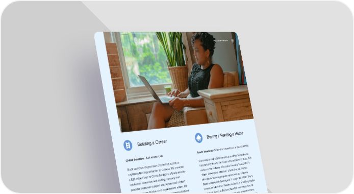 INCLUSIVE GROWTH Building a Career Buying / Renting a Home Chime Solutions · $35 million loan South Meadows · $75 million investment in the NAHT BDI Black women entrepreneurs cite limited access to Commercial real estate remains one of the least diverse capital as the largest barrier to success. We provided industries in the US. We made a commitment to invest $75 a $35 million loan to Chime Solutions, a Black woman- million in the National A昀昀ordable Housing Trust (NAHT) led human resources and sta昀케ng company that “Black Developers Initiative,” a fund that will 昀椀nance provides customer support and outsourced contact a昀昀ordable housing projects sponsored by primarily center services to blue-chip organizations across the Black women-led developers. Through the NAHT “Black 昀椀nancial services, healthcare, and telecommunications Developers Initiative,” Goldman Sachs is providing capital sectors. Chime’s mission is to create jobs with family- to Laurel Street, a Black woman-led real estate 昀椀rm, to sustaining wages and economic opportunity for people develop South Meadows, a mixed-use project in Rome, in underserved communities while helping its clients Georgia. South Meadows is a 100% a昀昀ordable residential deliver high-value customer care solutions. Chime’s development with 80 multifamily units, all of which will be o昀케ces are located in underserved communities, and a昀昀ordable to households earning between 30% and 80% they employ over 2,000 professionals, of which a of the area’s median income. South Meadows is adjacent to majority are Black Women. Chime also partners with a community farm providing healthy food in a low-income daycare operators to provide on-site subsidized child neighborhood and features a stand-alone learning facility. care services to its employees, a critical need in low- The housing, educational, and health programming are income communities that enables working parents to operated in partnership with the South Rome Alliance, a remain in the workforce. local nonpro昀椀t organization. SSuussttaaiinnaabbiilliittyy Re Reppoorrtt 2 2002121 IInncclluussiive Gve Grroowwtth | Oh | Onne Me Milliilolion Bn Blalacck Wk Woommeenn 5858