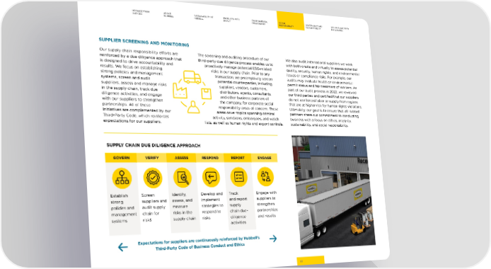MESSAGE FROM ABOUT SUSTAINABILITY AT PRODUCTS WITH ENVIRONMENTAL SOCIAL GOVERNANCE AND GRI, SASB, AND TCFD OUR CEO HUBBELL HUBBELL IMPACT STEWARDSHIP RESPONSIBILITY ACCOUNTABILITY DISCLOSURES SUPPLIER SCREENING AND MONITORING Our supply chain responsibility e昀昀orts are The screening and auditing procedure of our We also audit international suppliers we work reinforced by a due diligence approach that third-party due diligence process enables us to with both onsite and virtually to assess potential is designed to drive accountability and proactively manage potential ESG-related quality, security, human rights, and environmental results. We focus on establishing risks in our supply chain. Prior to any issues or compliance risks. For example, our strong policies and management transaction, we preemptively screen audits may evaluate health or environmental systems, screen and audit potential counterparties, including permit status and fair treatment of workers. As suppliers, assess and manage risks suppliers, vendors, customers, part of our audit process in 2022, we reviewed in the supply chain, track due distributors, agents, consultants, our third parties and certi昀椀ed that our suppliers diligence activities, and engage and other business partners of do not use forced labor or supply from regions with our suppliers to strengthen the company, for corporate social that are at higher risk for human rights violations. partnerships. All of these responsibility areas of concern. These Ultimately, our goal is to ensure that all Hubbell initiatives are complemented by our areas cover topics spanning criminal partners share our commitment to conducting Third-Party Code, which reinforces activity, sanctions, embargoes, and watch business with a focus on ethics, integrity, expectations for our suppliers. lists, as well as human rights and export controls. sustainability, and social responsibility. SUPPLY CHAIN DUE DILIGENCE APPROACH GOVERN VERIFY ASSESS RESPOND REPORT ENGAGE Establish Screen Identify, Develop and Track Engage with strong suppliers and assess, and implement and report suppliers to policies and audit supply measure strategies to supply strengthen management chain for risks in the respond to chain due- partnerships systems risks supply chain risks diligence and results activities Expectations for suppliers are continuously reinforced by Hubbell’s Third-Party Code of Business Conduct and Ethics 51