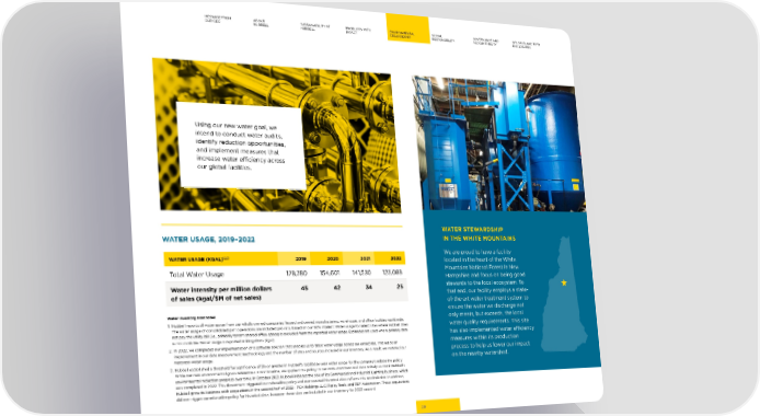 MESSAGE FROM ABOUT SUSTAINABILITY AT PRODUCTS WITH ENVIRONMENTAL SOCIAL GOVERNANCE AND GRI, SASB, AND TCFD OUR CEO HUBBELL HUBBELL IMPACT STEWARDSHIP RESPONSIBILITY ACCOUNTABILITY DISCLOSURES Using our new water goal, we intend to conduct water audits, identify reduction opportunities, and implement measures that increase water e昀케ciency across our global facilities. WATER STEWARDSHIP WATER USAGE, 2019–2022 IN THE WHITE MOUNTAINS We are proud to have a facility WATER USAGE (KGAL)1,2,3 2019 2020 2021 2022 located in the heart of the White Total Water Usage 178,780 154,601 141,530 123,088 Mountains National Forest in New Hampshire and focus on being good Water intensity per million dollars 45 42 34 25 stewards to the local ecosystem. To of sales (kgal/$M of net sales) that end, our facility employs a state- of-the-art water treatment system to ensure the water we discharge not Water Inventory Footnotes: only meets, but exceeds, the local 1. Hubbell reports all water usage from our wholly owned companies’ leased and owned manufacturing, warehouse, and o昀케ce facilities worldwide. The water usage of consolidated joint operations are included pro rata, based on our 50% interest. Water usage for select sites where Hubbell does water quality requirements. This site not pay the utility bill (i.e., primarily tenant-shared o昀케ce space) is excluded from the reported water usage. Estimates are used where primary data has also implemented water e昀케ciency is not available. Water usage is reported in kilogallons (kgal). measures within its production 2. In 2022, we completed our implementation of a software solution that enables us to track water usage across our enterprise. This led to an improvement in our data measurement methodology and the number of sites and sources included in our inventory. As a result, we restated our process to help us lower our impact historical water usage. on the nearby watershed. 3. Hubbell established a threshold for signi昀椀cance of 5% or greater in Hubbell’s total base-year water usage for the company’s rebaseline policy. While our new environmental goals reference a 2022 baseline, we applied this policy to our 2019-2021 historical data to help us track Hubbell’s environmental reduction progress over time. In October 2021, Hubbell initiated the sale of its Commercial and Industrial Lighting business, which was completed in 2022. This divestment triggered our rebaseline policy and our restated historical data re昀氀ects this recalculation. In addition, Hubbell grew its business with acquisitions in the second half of 2022 - PCX Holdings LLC, Ripley Tools, and REF Automation. These acquisitions did not trigger our rebaseline policy for historical data, however these sites are included in our inventory for 2022 onward. 29