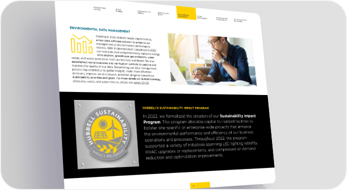 MESSAGE FROM ABOUT SUSTAINABILITY AT PRODUCTS WITH ENVIRONMENTAL SOCIAL GOVERNANCE AND GRI, SASB, AND TCFD OUR CEO HUBBELL HUBBELL IMPACT STEWARDSHIP RESPONSIBILITY ACCOUNTABILITY DISCLOSURES ENVIRONMENTAL DATA MANAGEMENT Starting in 2021, Hubbell began implementing a new data software solution to enhance our management of environmental performance metrics. With implementation completed in 2022, our new data tool comprehensively captures energy consumption, greenhouse gas emissions, water usage, and waste generation from our facilities worldwide. We also established new procedures and veri昀椀cation controls to capture and maintain the quality of our data. Streamlining our data management process has enabled us to gather insights, make more informed decisions, improve our disclosures, and drive progress toward our sustainability priorities and goals. For more details on Hubbell’s energy, emissions, waste, and water metrics, please see pages 25–32. HUBBELL’S SUSTAINABILITY IMPACT PROGRAM In 2022, we formalized the creation of our Sustainability Impact Program. This program allocates capital to Hubbell facilities to bolster site-speci昀椀c or enterprise-wide projects that enhance the environmental performance and e昀케ciency of our business operations and processes. Throughout 2022, the program supported a variety of initiatives spanning LED lighting retro昀椀ts, HVAC upgrades or replacements, and compressed air demand reduction and optimization improvements. 23