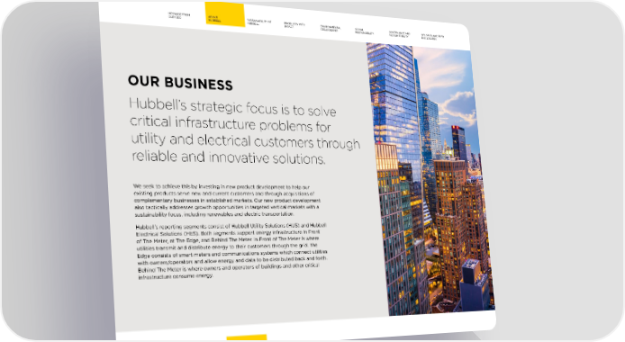 MESSAGE FROM ABOUT SUSTAINABILITY AT PRODUCTS WITH ENVIRONMENTAL SOCIAL GOVERNANCE AND GRI, SASB, AND TCFD OUR CEO HUBBELL HUBBELL IMPACT STEWARDSHIP RESPONSIBILITY ACCOUNTABILITY DISCLOSURES OUR BUSINESS Hubbell’s strategic focus is to solve critical infrastructure problems for utility and electrical customers through reliable and innovative solutions. We seek to achieve this by investing in new product development to help our existing products serve new and current customers and through acquisitions of complementary businesses in established markets. Our new product development also tactically addresses growth opportunities in targeted vertical markets with a sustainability focus, including renewables and electric transportation. Hubbell’s reporting segments consist of Hubbell Utility Solutions (HUS) and Hubbell Electrical Solutions (HES). Both segments support energy infrastructure In Front of The Meter, at The Edge, and Behind The Meter. In Front of The Meter is where utilities transmit and distribute energy to their customers through the grid. The Edge consists of smart meters and communications systems which connect utilities with owners/operators and allow energy and data to be distributed back and forth. Behind The Meter is where owners and operators of buildings and other critical infrastructure consume energy. 7