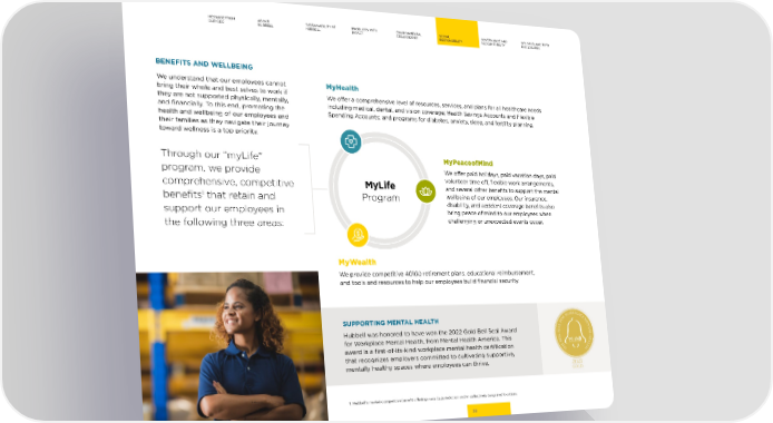 MESSAGE FROM ABOUT SUSTAINABILITY AT PRODUCTS WITH ENVIRONMENTAL SOCIAL GOVERNANCE AND GRI, SASB, AND TCFD OUR CEO HUBBELL HUBBELL IMPACT STEWARDSHIP RESPONSIBILITY ACCOUNTABILITY DISCLOSURES BENEFITS AND WELLBEING We understand that our employees cannot MyHealth bring their whole and best selves to work if We o昀昀er a comprehensive level of resources, services, and plans for all healthcare needs they are not supported physically, mentally, including medical, dental, and vision coverage; Health Savings Accounts and Flexible and 昀椀nancially. To this end, promoting the Spending Accounts; and programs for diabetes, anxiety, sleep, and fertility planning. health and wellbeing of our employees and their families as they navigate their journey toward wellness is a top priority. Through our “myLife” MyPeaceofMind program, we provide We o昀昀er paid holidays, paid vacation days, paid comprehensive, competitive MyLife volunteer time o昀昀, 昀氀exible work arrangements, and several other bene昀椀ts to support the mental 1 Program wellbeing of our employees. Our insurance, bene昀椀ts that retain and disability, and accident coverage bene昀椀ts also support our employees in bring peace of mind to our employees when the following three areas: challenging or unexpected events occur. MyWealth We provide competitive 401(k) retirement plans, educational reimbursement, and tools and resources to help our employees build 昀椀nancial security. SUPPORTING MENTAL HEALTH Hubbell was honored to have won the 2022 Gold Bell Seal Award for Workplace Mental Health, from Mental Health America. This award is a 昀椀rst-of-its-kind workplace mental health certi昀椀cation that recognizes employers committed to cultivating supportive, mentally healthy spaces where employees can thrive. 1. Hubbell’s market-competitive bene昀椀t o昀昀erings vary by jurisdiction and in collectively bargained locations. 36