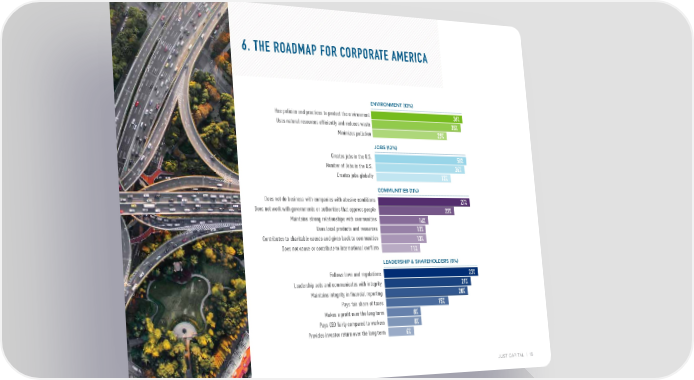 6. thE roAdmAP For corPorAtE AmErIcA enViROnMenT (13%) Has policies and practices to protect the environment 36% Uses natural resources ef昀椀ciently and reduces waste 35% Minimizes pollution 29% JOBs (12%) Creates jobs in the U.S. 50% Number of Jobs in the U.S. 36% Creates jobs globally 13% COMMUniTies (11%) Does not do business with companies with abusive conditions 27% Does not work with governments or authorities that oppress people 22% Maintains strong relationships with communities 14% Uses local products and resources 13% Contributes to charitable causes and gives back to communities 13% Does not cause or contribute to international con昀氀icts 11% leAdeRshiP & shARehOldeRs (8%) Follows laws and regulations 23% Leadership acts and communicates with integrity 21% Maintains integrity in 昀椀nancial reporting 20% Pays fair share of taxes 15% Makes a pro昀椀t over the long term 8% Pays CeO fairly compared to workers 8% Provides investor return over the long term 6% JUST CAPITAL | 19