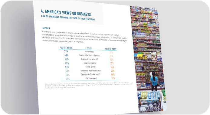 4. AmErIcA’s vIEws on BusInEss How do AmericAns perceive tHe stAte of business todAy? iMPACT Americans see companies as having a generally positive impact on society – particularly for their shareholders, as well as in how they support local communities, create jobs in the U.S., and provide quality products and services. On issues like environment and international communities, however, the majority of Americans do see corporate impact as negative. POSITIVe IMPACT ISSUeS NeGATIVe IMPACT 72% Shareholders 19% 68% Quality of Products & Services 27% 65% Quality of Jobs in the U.S. 32% 62% Local Communities 32% 58% Society Overall 36% 50% employees’ Work-life balance 43% 40% Communities Outside the U.S. 46% 38% The environment 57% Q: Do you think large companies are having a very positive impact, a somewhat positive impact, a somewhat negative impact, a very negative impact, or no impact on: [ISSUE]? Base: Varies by issue, range N = 932 to 1,070 (unweighted), MOE +/- 4.5 percentage points; N = 4,083 (unweighted), MOE +/- 2.1 percentage points for “society overall.” Note: Numbers might not sum to 100% due to rounding. JUS JUST CT CAPITAPITAL | 7AL | 7