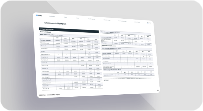 Leadership About Vision How We Operate What We Create How We Collaborate Looking Ahead Data Index Environmental footprint 3.1 Water withdrawal 9 Water withdrawal by facility (in cubic meters) Water withdrawal 2017 2018 2019 2020 2021 2022 Water withdrawal by facility (in cubic meters) Leased data center facilities 473,000 533,000 1,011,000 645,000 603,629 772,921 2017 2018 2019 2020 2021 2022 Other data center-related 85,000 264,000 54,000 42,000 197 0 facilities Total water withdrawal 1,609,000 2,367,000 3,430,000 3,726,000 5,042,564 4,893,023 Offices total 470,000 631,000 699,000 726,000 1,624,773 1,275,021 Data centers total 1,139,000 1,730,000 2,731,000 3,000,000 3,417,791 3,618,003 Water withdrawal by source Altoona, IA 106,000 139,000 145,000 151,000 140,231 199,378 Water withdrawal by source (in cubic meters) Clonee, Ireland 10,000 188,000 395,000 615,000 927,914 838,654 2017 2018 2019 2020 2021 2022 Dekalb, IL - - - - 0 29,659 Total water withdrawal 1,609,000 2,367,000 3,430,000 3,726,000 5,042,564 4,893,023 Eagle Mountain, UT - - - - 57,701 89,366 From surface water - - - - 0 0 Forest City, NC 129,000 99,000 85,000 68,000 64,053 62,853 From groundwater - - - 37,000 33,285 37,343 Fort Worth, TX 98,000 269,000 322,000 300,000 253,520 346,115 From seawater - - - - 0 0 Gallatin, TN - - - - 0 0 From produced water - - - - 0 0 Richmond, VA - - - 42,000 80,478 54,994 From third-party water (e.g. municipal water supply) - - - 3,689,000 5,009,279 4,855,680 Huntsville, AL - - - - 38,520 103,501 Water usage effectiveness (WUE) Los Lunas, NM - 25,000 92,000 140,000 152,666 161,436 2017 2018 2019 2020 2021 2022 Luleå, Sweden 66,000 53,000 58,000 49,000 38,922 25,358 Annual data center WUE 0.24 0.27 0.27 0.30 0.26 0.20 New Albany, OH - - 33,000 35,000 121,194 87,413 Newton County, GA - - - - 105,121 77,203 9. Not included in Meta’s 2022 water withdrawal numbers are an additional 1,780,000 cubic meters of water withdrawn for the construction of Meta data centers. Odense, Denmark - - 266,000 360,000 373,355 427,937 Papillion, NE - - 62,000 108,000 106,339 100,912 Prineville, OR 172,000 160,000 208,000 445,000 353,951 240,302 2023 Meta Sustainability Report 53