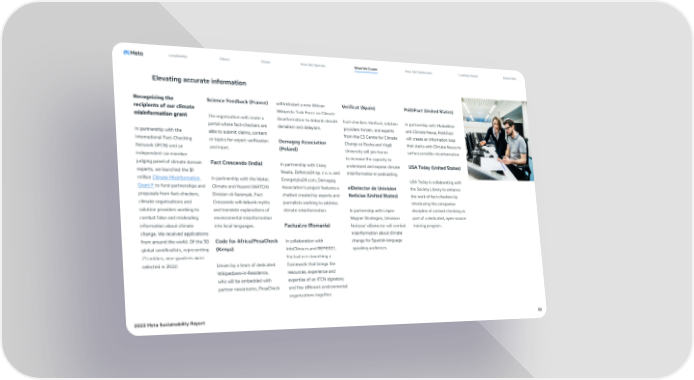 Leadership About Vision How We Operate What We Create How We Collaborate Looking Ahead Data Index Elevating accurate information Recognizing the Science Feedback (France) will kickstart a new African Verificat (Spain) PolitiFact (United States) recipients of our climate Wikipedia Task Force on Climate misinformation grant The organization will create a Disinformation to debunk climate Fact-checkers Verificat, solution In partnership with MediaWise portal where fact-checkers are denialism and delayism. providers Kinzen, and experts and Climate Nexus, PolitiFact In partnership with the able to submit claims, content from the C3 Centre for Climate will create an information loop International Fact-Checking or topics for expert verification Demagog Association Change at Rovira and Virgili that starts with Climate Nexus to Network (IFCN) and an and input. (Poland) University will join forces surface possible misinformation. independent six-member to increase the capacity to judging panel of climate domain Fact Crescendo (India) In partnership with Crazy understand and expose climate USA Today (United States) experts, we launched the $1 Nauka, Defence24 sp. z o. o. and misinformation in podcasting. million Climate Misinformation In partnership with the Water, Energetyka24.com, Demagog USA Today is collaborating with Grant↗ to fund partnerships and Climate and Hazard (WATCH) Association’s project features a elDetector de Univision the Society Library to enhance proposals from fact-checkers, Division of Aaranyak, Fact chatbot created by experts and Noticias (United States) the work of fact-checkers by climate organizations and Crescendo will debunk myths journalists working to address introducing the companion solution providers working to and translate explanations of climate misinformation. In partnership with López- discipline of context-checking as combat false and misleading environmental misinformation Wagner Strategies, Univision part of a dedicated, open-source information about climate into local languages. Factual.ro (Romania) Noticias’ elDetector will combat training program. change. We received applications misinformation about climate from around the world. Of the 30 Code for Africa/PesaCheck In collaboration with change for Spanish-language global semifinalists, representing (Kenya) InfoClima.ro and REPER21, speaking audiences. 71 entities, nine grantees were Factual.ro is launching a selected in 2022: Driven by a team of dedicated framework that brings the Wikipedians-in-Residence, resources, experience and who will be embedded with expertise of an IFCN signatory partner newsrooms, PesaCheck and five different environmental organizations together. 2023 Meta Sustainability Report 32